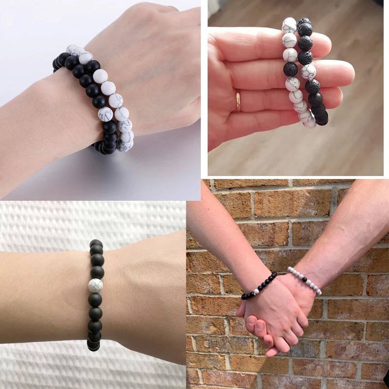 Conjunto 2 Pulseiras Yin Yang Unissex Casal 8mm Pedra Vulcânica howlita branca Kit Braceletes Masc Fem Presente moda