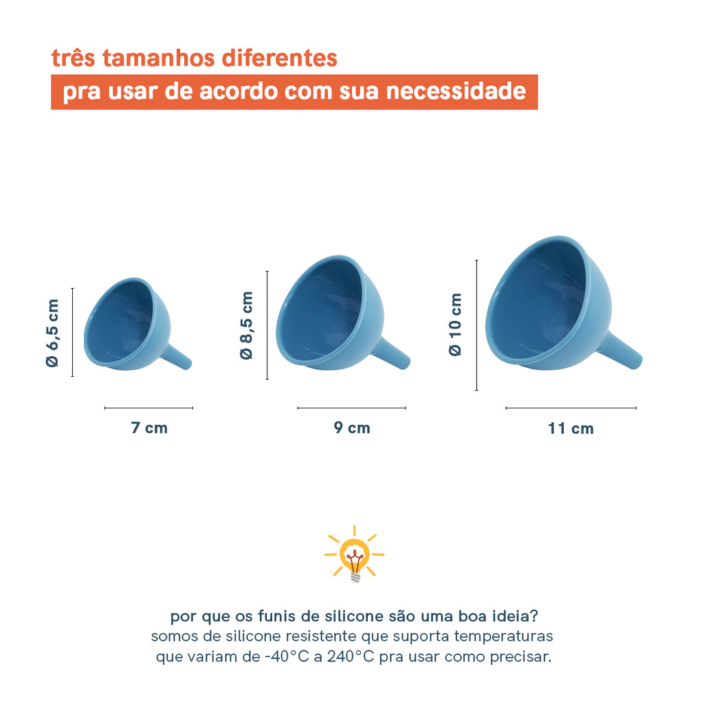 :: esse é o conjunto com 3 funis de silicone da OIKOS. :: prático: bacana para evitar o desperdício na hora de direcionar líquidos ou ingredientes em garrafas ou potes. :: silicone resistente: ele surpreende com seu toque macio e maleável. :: fácil de guardar: encaixam entre si na hora de guardar – ótimo para economizar espaço dentro do armário! :: mais higiênico: o silicone não retém cheiros, manchas e nem prolifera bactérias. :: livre de BPA: não libera substâncias tóxicas na comida, mais segurança para sua família.