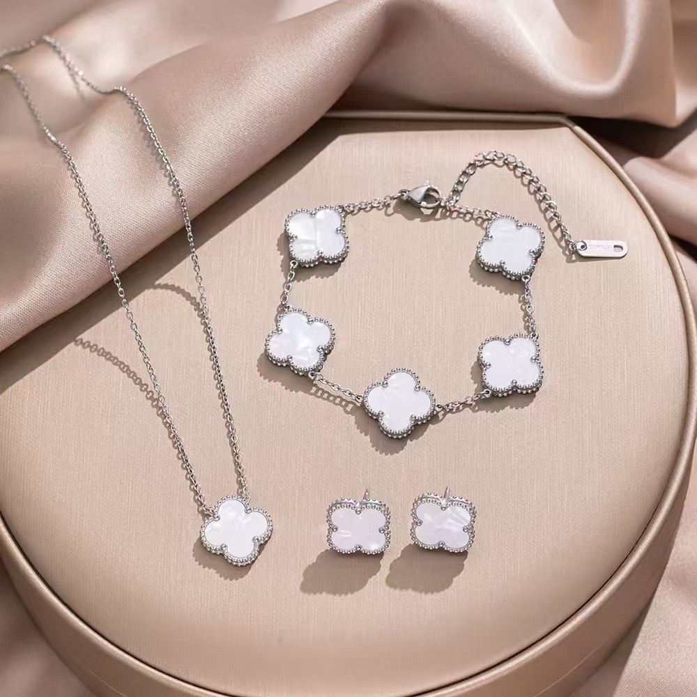 Conjunto 3 peças de colar, pulseira e brincos de trevo de quatro folhas em aço inoxidável prateado, à prova d'água
