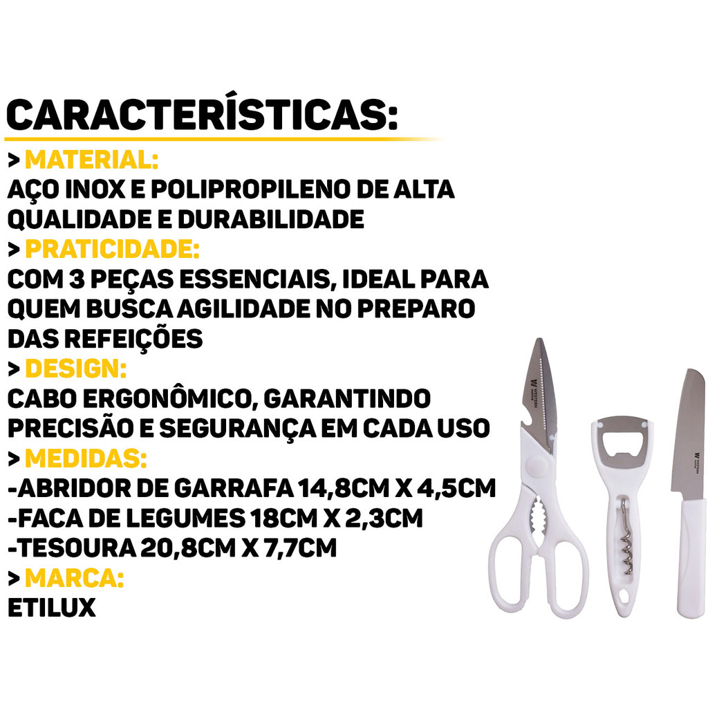 Kit Culinário Com Tesoura 3 Peças Western O Kit Culinário é a solução perfeita para quem busca praticidade e eficiência na cozinha. Com três utensílios essenciais, este kit oferece alta qualidade para facilitar a preparação de suas receitas. Características: > Produzido em aço inox e polipropileno; > O kit acompanha 1 abridor de garrafas, 1 tesoura e 1 faca; > As lâminas afiadas garantem excelente desempenho no corte. Especificações Técnicas: > Material: aço inox e polipropileno; > Dimensões: - Faca: 18cm x 2,3cm x 1cm; - Tesoura: 20,8cm x 7,7cm x 1,2cm; - Abridor de garrafa: 14,8cm x 4,5cm x 1,2cm. - Marca: Western - Garantia: 90 dias contra defeitos de fabricação Vantagens de comprar na Brester: - Produto a pronta entrega. - Produto novo, com garantia de fábrica. - Nota fiscal para Pessoa Física e Pessoa Jurídica.