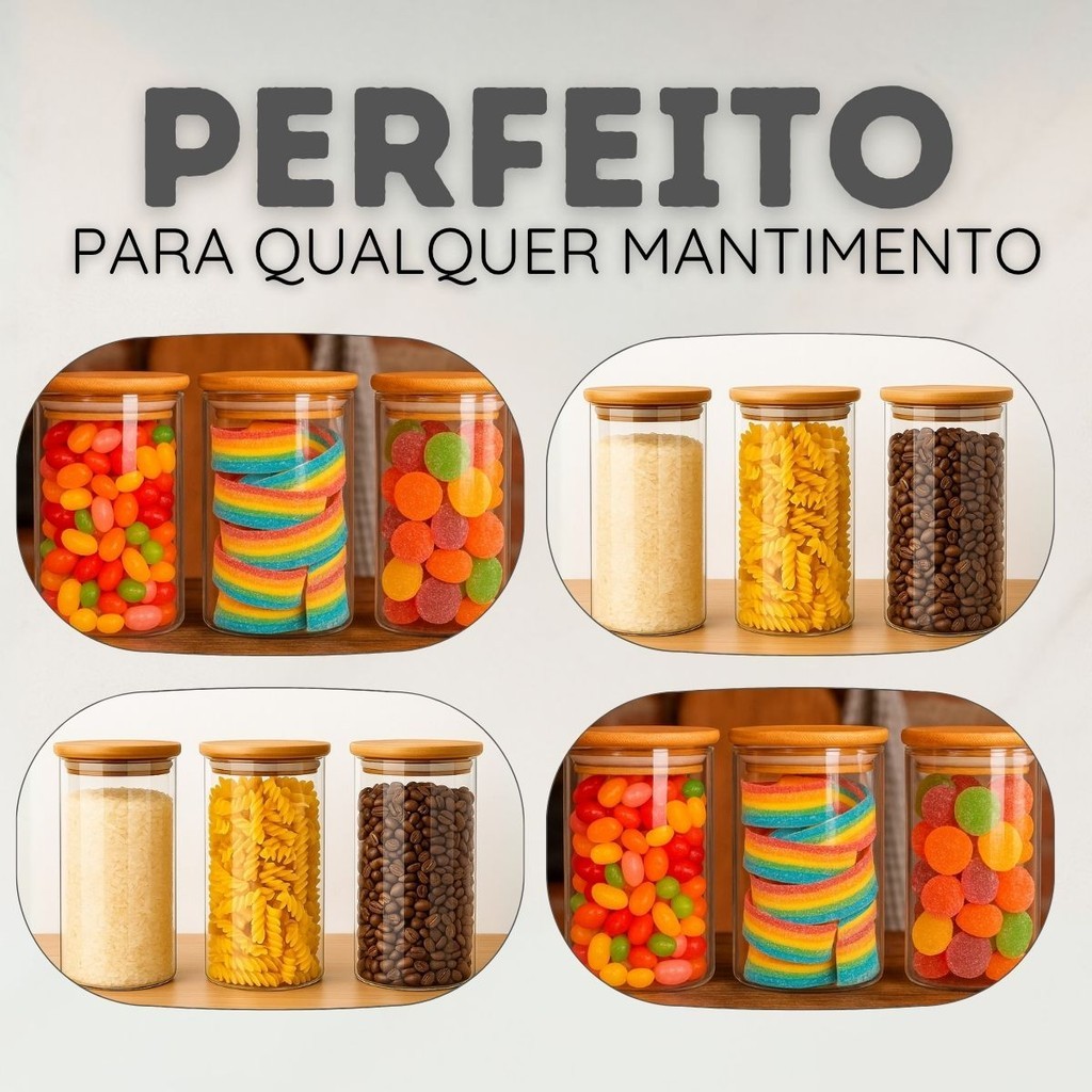 Conjunto 3 Potes Herméticos Com 800ml De Vidro Redondo Tampa De Bambu Mantimentos Tempero Alimento