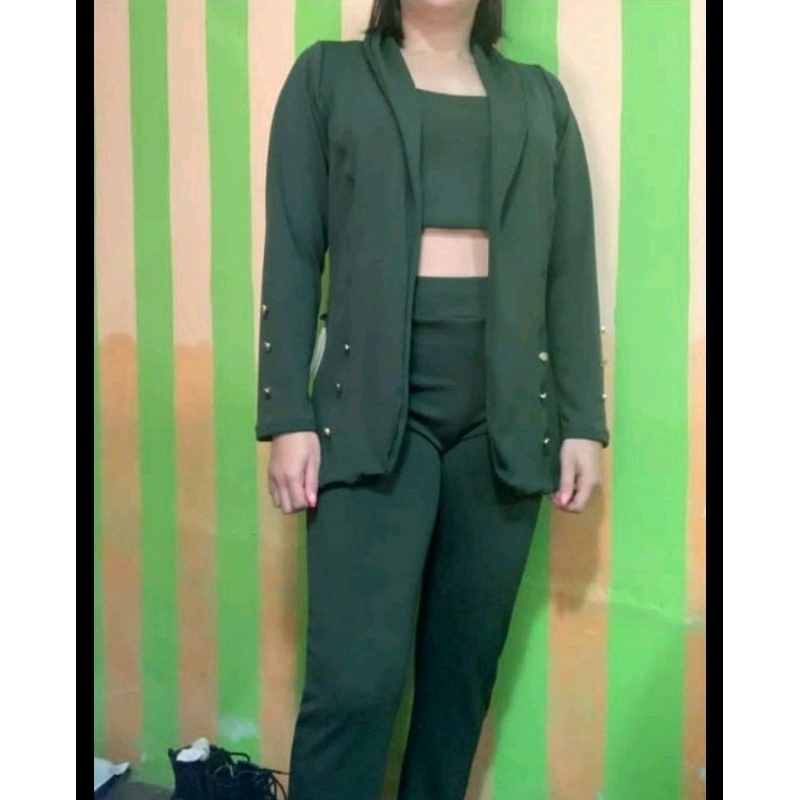 Conjunto 3 Três Peças Tipo Alfaiataria Calça Cropped Blazer Malha Crepe Conjunto Feminino Social Detalhes: Conjunto composto por uma calça,um cropped e um casaco blazer em tecido malha creponada ponto roma Modelo do blazer com detalhes de botão frontal e nas mangas Modelo do cropeed embutido com duas camadas de tecido que proporciona uma melhor resistência dispensando assim o uso do sutian Modelo da calça,não tem ziper e nem botões Tecido: Malha Crepe (Tecido grosso) Composição: Poliéster 96% / Elastano 4% Tecido possui bastante elasticidade. TAMANHO UNICO veste do 38 ao 44 * As cores das fotos podem variar de acordo com a configuração do seu monitor, bem como as condições de iluminação do estúdio fotográfico e também conforme o lote de cada tecido que as vezes vem com uma tonalidade de cor em um tom um pouco mais claro ou um pouco mais escuro.