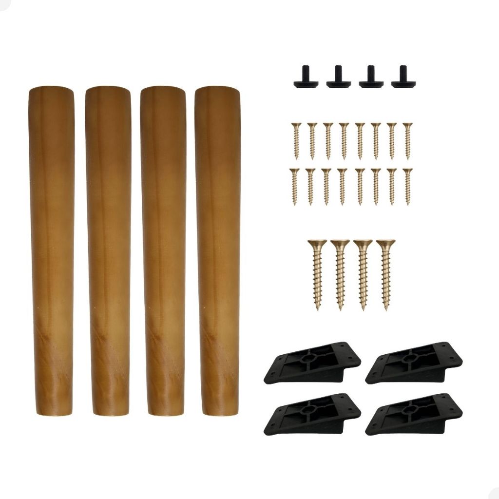 Conjunto de 4 Pés para móveis sendo 4 grandes! ***Atenção: NÃO ACOMPANHA AS MESAS DAS FOTOS, SOMENTE OS PÉS! Olá, tudo bem ? Satisfação em mostrar os nossos produtos para você!!! Somos a empresa Beto Móveis, atuamos no mercado moveleiro a mais 28 anos. Atuamos com qualidade e desempenho e agilidade para atender nossos clientes e levando para eles a sensação de conforto e confiança! E não é diferente hoje, estamos com produtos novos e disponibilizando a todos vocês que querem ser bem atendidas! O Kit de Pés palito para móvel são peças usadas para elevar e dar suporte a móveis decorativos, como mesas de canto, puffs e outros. Eles podem ser ajustados para nivelar o móvel em superfícies irregulares. São fáceis de instalar e permitem que o móvel seja movido com facilidade. O kit conta com as seguintes informações: ATENÇÃO: PÉS DESENVOLVIDOS PARA MÓVEIS DE DECORAÇÃO NOSSOS PÉS É PARA MÓVEIS DECORATIVO, O PESO SUPORTADO PELOS PÉS É DE 10KG CADA, PARA MÓVEIS GRANDES (RACK, APARADOR, MESAS PESADAS E OUTROS) PEÇA A AJUDA DE UM PROFISSIONAL PARA CALCULAR O PESO E A DISTRIBUIÇÃO DOS PÉS. Especificações: -Feito em madeira pinus de reflorestamento -Acabamento com verniz P.U de alta resistência -Formato cônico Dimensões: - Pé de 30cm = 5 cm ponta superior e 2,8 ponta inferior Itens inclusos no kit: -4 pés (4 de 30 cm ) -16 parafusos de 3,5 X 16 mm ( Serve para fixar a chapinha na peça) -4 parafusos de 6,0 x 40 mm ( Serve para fixar o pé na chapinha) -4 chapinhas de Nylon de Alta resistência! Vendemos na cor Mel igual da foto mas se o cliente querer mais claro ou mais escuro conseguimos também!!! Envio em 24 horas imediato!