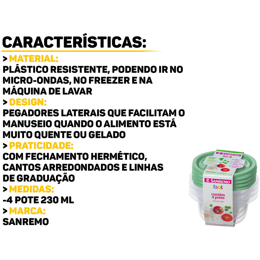 Conjunto 4 Potes Plásticos 230ml Sanremo O Conjunto 4 Potes Sanremo são ideais para organizar e armazenar seus alimentos de maneira prática e segura. Possui design moderno, e pegadores nas laterais que facilitam o manuseio do pote quando aquecido ou em baixa temperatura. Fabricados em plástico resistente, esses potes garantem a durabilidade e a preservação dos alimentos por mais tempo. Características: > Livre de BPA; > Cores sortidas; > Pode ir ao freezer, micro-ondas e lava-louças; > Tampa com saliências nas extremidades que facilitam a abertura do produto; > Possui linhas de graduação de volume que facilitam o controle da quantidade de alimento armazenado. Especificações Técnicas: > Material: plástico; > O kit acompanha 4 potes de 230ml cada. - Marca: Sanremo - Garantia: 90 dias contra defeitos de fabricação Vantagens de comprar na Brester: - Produto a pronta entrega. - Produto novo, com garantia de fábrica. - Nota fiscal para Pessoa Física e Pessoa Jurídica.