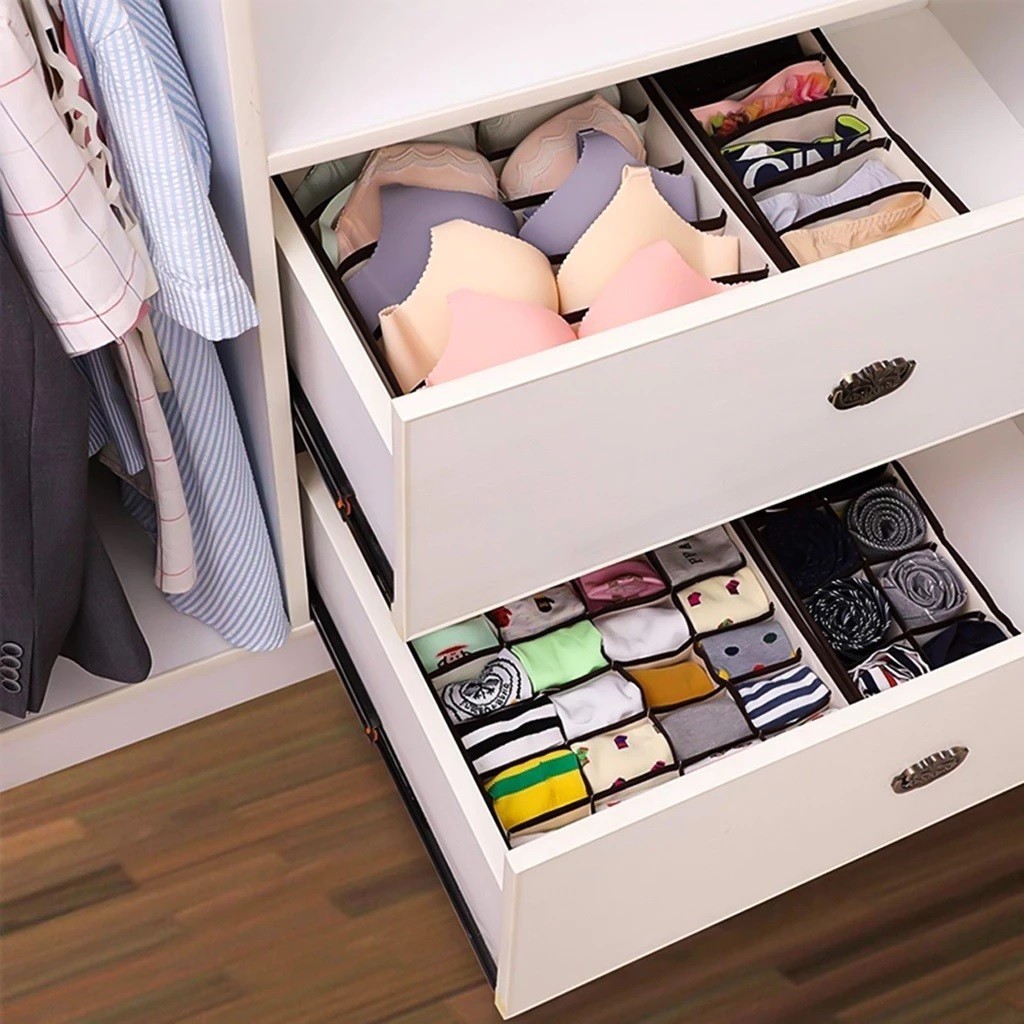 DESCRIÇÃO: Esse organizador é ideal para guardar suas roupas íntimas e encontrá-las facilmente quando precisar. ela é feita em material ecológico tnt, anti bolor que permite a passagem de ar tornando o produto resistente a umidade. Produto super fácil de lavar, totalmente dobrável sendo fácil de guardar quando não utilizada, suas bordas são reforçadas o que permitem que sejam empilhados ou colocados em prateleiras. - Feita de TNT é respirável e permite haja circulação do ar - Acaba com a bagunça das seu closet, guarda-roupas, despensas, armários e mantém roupas, cobertas, brinquedos, livros e outros itens organizados - Anti-poeira - Anti- umidade - Anti-insetos - Qualidade, resistência, durabilidade e praticidade - Compacta sendo possível levá-la para qualquer parte da sua casa - Fácil manuseio, sendo possível montá-la e desmontá-la caso precise de mais espaço INSTRUÇÕES DE LAVAGEM: - Não permitido - Não usar alvejante - Não secar em tambor - Não passar a ferro - Limpeza a seco com tetracloroetileno Especificações Material: TNT MEDIDAS DE CADA DIVISÓRIA KIT COM 4 PEÇAS: 24 Divisórias : 30x33x10,5Cm 8 Divisórias : 10x29x10,5Cm 7 Divisórias: 30x33x10,5Cm 6 Divisórias : 16x33x10,5Cm