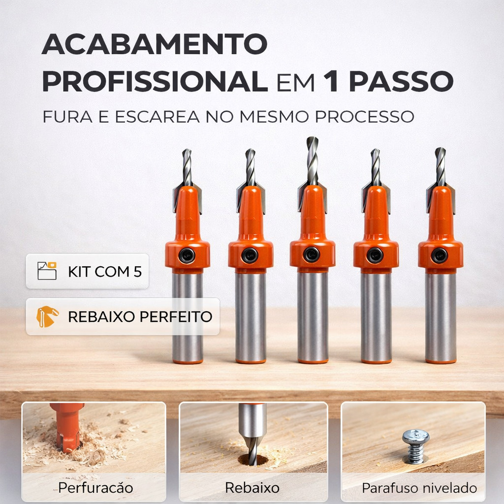 Conjunto 5 Brocas Escareadoras 8mm HSS com Guia de Profundidade Profissional