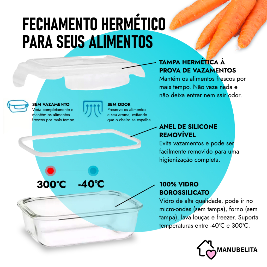 CONJUNTO DE 6 POTES DE VIDRO HERMETICOS PARA MARMITA / ALIMENTOS Os potes possuem tampa de fechamento hermético que mantém seu alimento fresco por mais tempo e permite transportá-lo com mais segurança sem risco de vazamento. As tampas são fabricadas em polietileno, o que evita que o cheiro do alimento se espalhe. Os potes de vidro são do tamanho ideal para armazenar marmitas e facilitar a organização na cozinha. Benefícios de armazenar alimentos em pote de vidro: A embalagem de vidro é feita de material puro, que preserva todos os aspectos do ingrediente: sabor, qualidade, cheiro, cor e características do alimento. Além disso, o vidro é um material totalmente reciclável, contribuindo para a proteção do meio ambiente. Para maior praticidade, a marmita de vidro pode ser aquecida diretamente no micro-ondas sem riscos de explosão ou liberação de substâncias nocivas. Garantia do vendedor: 30 dias