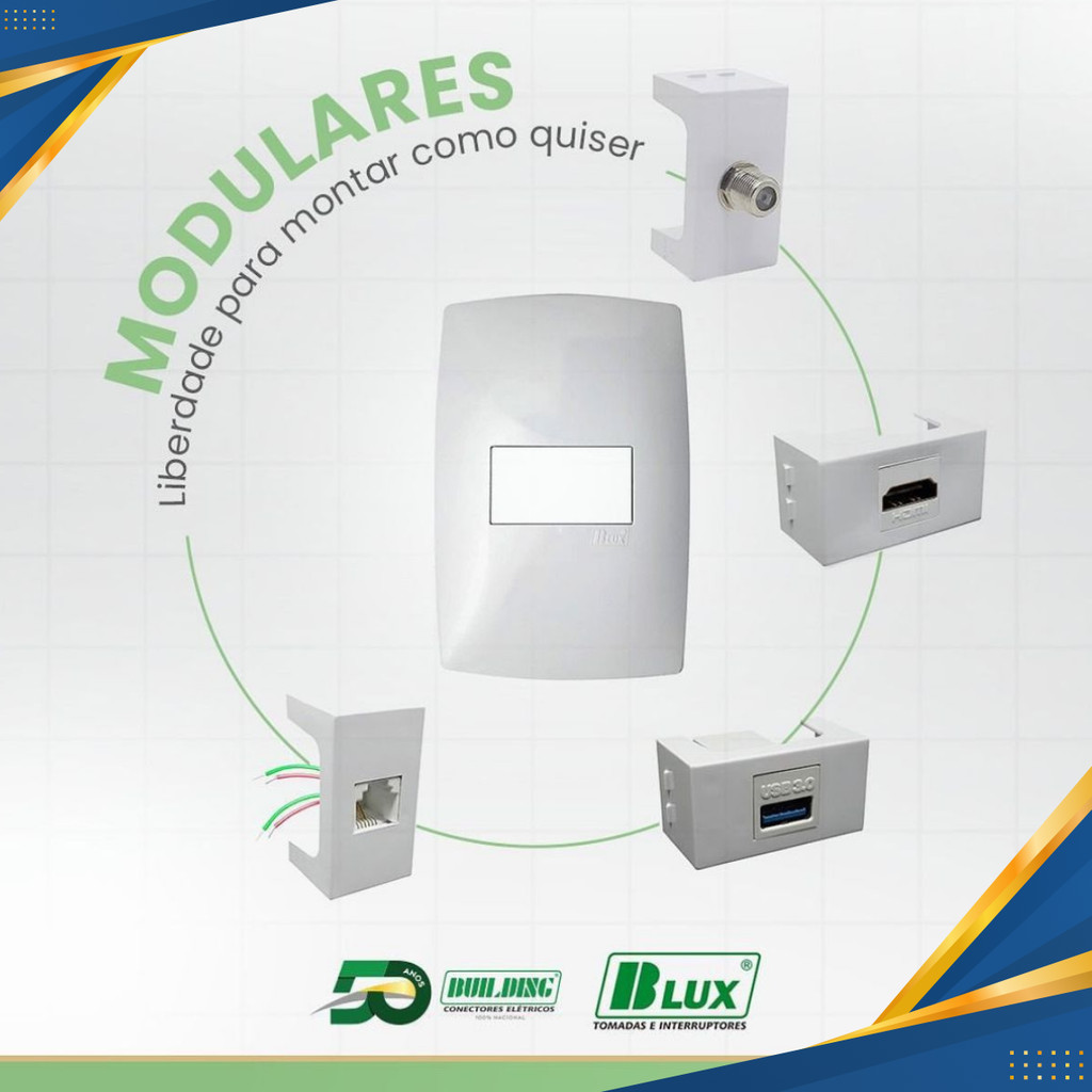Escolha a cor através da variação! Kit inclui: • 01 Placa 4x4 para 6 módulos home; • 06 módulos tomada 10a home. A linha B.Lux não surgiu para ser apenas mais um fabricante de tomadas e interruptores e sim, para trazer novas soluções, que facilitem e agilizem a aplicação dos produtos pelo consumidor. Com o objetivo de diversificar sua linha de produtos, a Building idealizou a B.Lux de tomadas, interruptores e acessórios. Produto com design inovador, a linha HOME foi criada para possibilitar infinitas combinações entre os módulos, suporte e placas. Elegância que transforma ambientes em locais aconchegantes e discretos, faz com que o produto seja parte integrante do ambiente, sem o impacto causado pelo contraste de cores. Os módulos de interruptores e tomadas B-LUX HOME são os únicos com 4 entradas para cabos independentes em cada borne, facilitando a aplicação e flexibilizando as opções de instalações adicionais. Através da utilização de matérias primas nobres, componentes e mecanismos diferenciados, a linha B.Lux é a única do mercado nacional a oferecer 15 ANOS DE GARANTIA. Sim. A Builtrade há mais de 40 anos no mercado, oferece Garantia de fábrica 15 anos, qualidade e elegância num mesmo produto! Tratamento anti UV.