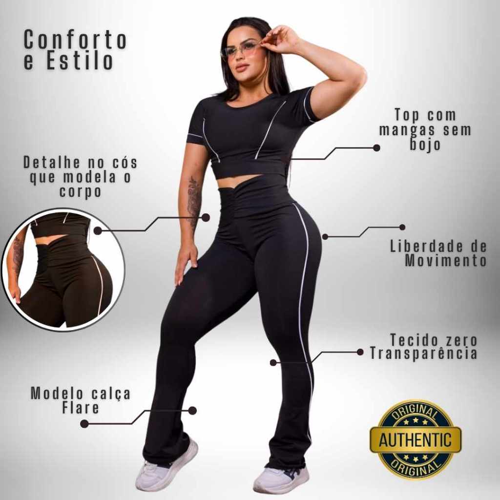 Conjunto Fitness Feminino Top + Calça Legging Flare – Suplex Premium, Alta Compressão e Zero Transparência O Conjunto Fitness Top e Calça Legging é ideal para quem busca conforto, estilo, sustentação e performance durante os treinos. Produzido em Suplex Premium com elastano, oferece alta compressão, valorizando o corpo e garantindo liberdade total de movimentos para musculação, caminhada, corrida, yoga e uso diário. O kit inclui top + calça legging flare, ambos no mesmo tamanho e nas cores reais das fotos, formando um look moderno e sofisticado. Benefícios do Conjunto: -Alta compressão e elasticidade que modelam a silhueta -Zero transparência quando comprado no tamanho adequado -Tecido macio, flexível, respirável e que não esquenta -Recortes laterais brancos que valorizam o visual e dão acabamento premium -Caimento impecável e liberdade total de movimentos -Não desbota, não cria bolinhas e possui longa durabilidade -Ideal para academia, treinos intensos, caminhadas e uso casual Características do Conjunto: -Composição: Suplex com elastano -Kit composto por: Top + Calça Legging Flare (boca larga) -Calça modelo flare, com boca larga na barra que alonga a silhueta -Cós duplo com elástico interno e costura reforçada na cintura para maior sustentação -Top modelo cropped com mangas, sem bojo -Tecido com toque suave, firme e confortável -Recortes brancos estrategicamente posicionados para realçar o corpo e deixar o look mais estiloso Para a melhor experiência, verifique o tamanho antes de finalizar a compra. O ajuste correto garante mais conforto e evita transparência. Nossos Diferenciais: -Atendimento pós-venda até o produto chegar a você -Compra segura: entrega garantida ou seu dinheiro de volta -Fotos reais do produto Qualquer dúvida, fale com nossos especialistas no chat. Boas compras!