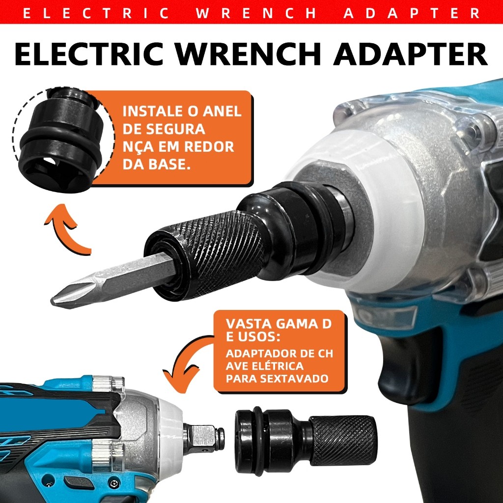 🔹 Descrição do Produto Este conjunto de adaptador para chave de impacto elétrica transforma sua ferramenta em uma multifuncional, permitindo o uso de brocas, bits e parafusos de diferentes tamanhos. Fabricado em aço de alta resistência, garante durabilidade e precisão em trabalhos de perfuração, parafusamento e montagem. Ideal para uso doméstico, profissional e em oficinas. 🔹 Componentes Inclusos 1x Mandril de broca (1,5-13mm, 1/2"-20 UNF) 1x Chave de fixação para mandril 1x Adaptador de bits hexagonal (1/4") 1x Adaptador de parafuso (1/2" para rosca M10x1) 1x Anel de segurança 1x Pino de travamento + Parafusos de fixação 🔹 Especificações Técnicas ItemEspecificaçãoMaterialAço forjado + tratamento anti-desgasteMandril de broca1,5-13mm, interface 1/2"-20 UNFAdaptador de bits1/4" hexagonal, compatível com bits padrãoAdaptador de parafuso1/2" quadrado para rosca M10x1Dimensões do mandril4cm (diâmetro) x 7cm (altura)Dimensões do adaptador de bits2,2cm (diâmetro) x 5cm (altura)Dimensões do adaptador de parafuso2,1cm (diâmetro) x 4cm (altura)Chave de fixação7,8cm (comprimento total) 🔹 Parâmetros Principais Compatibilidade: Adequado para chaves de impacto elétricas de 1/2" (quadrado drive) Resistência: Suporta torque elevado, ideal para trabalhos pesados Instalação: Montagem rápida sem ferramentas extras, anel de segurança evita desprendimento Versatilidade: Permite troca entre brocas, bits e acessórios em segundos 🔹 Cenários de Uso Perfuração: Madeira, metal, plástico e alvenaria com brocas de diferentes diâmetros Parafusamento: Instalação de parafusos, parafusos de drywall e parafusos de madeira com bits hexagonal Montagem: Montagem de móveis, instalação de eletrodomésticos e reparos automotivos Oficina: Trabalhos de manutenção e reparo em oficinas domésticas e profissionais 🔹 Vantagens do Produto ✅ Multifuncional: 6 peças em um conjunto, atende a diversas necessidades de trabalho✅ Durabilidade: Aço de alta qualidade, resistente ao desgaste e à corrosão✅ Segurança: Anel de segurança e pino de travamento garantem estabilidade durante o uso✅ Facilidade de uso: Instalação e troca de acessórios em segundos, sem complicações✅ Ampla compatibilidade: Funciona com a maioria das chaves de impacto elétricas de 1/2" do mercado