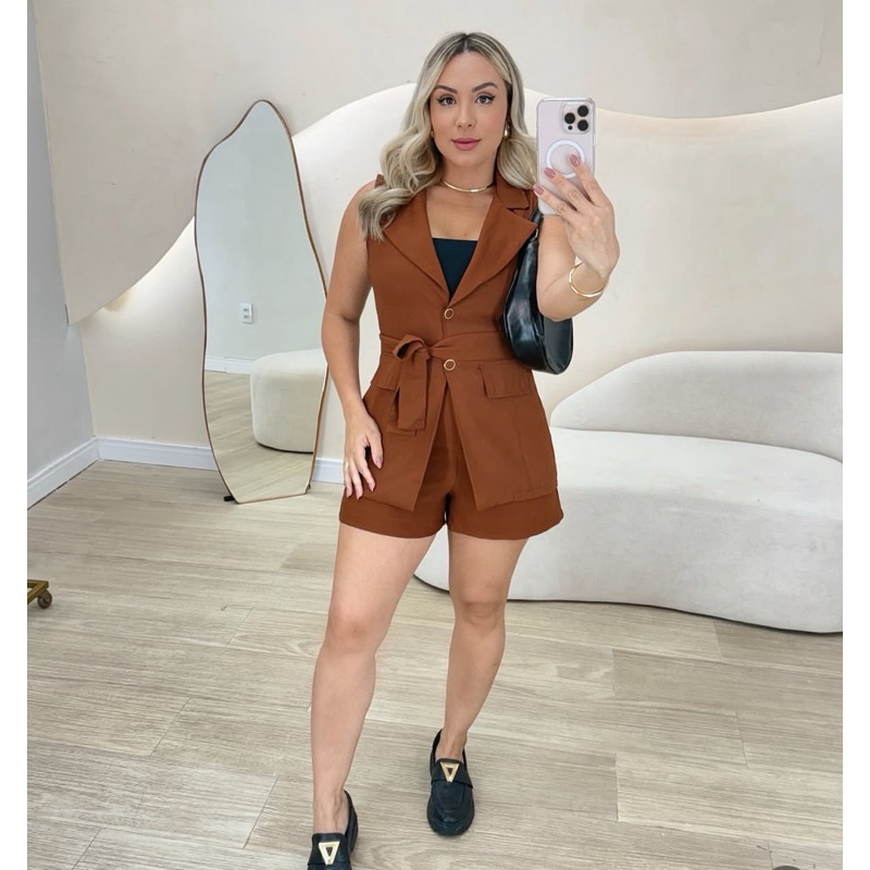 Olá, seja bem vindo (a) a Mally Store! TECIDO: ALFAIATARIA TAMANHO: M e G conjunto composto por shorts e colete; shorts não possui forro; shorts possui bolsos na frente; modelo de barra feita; fechamento em zíper e botão; colete possui fechamento em botão na frente; possui tira de amarração removível; possui gola; não possui forro; tecido alfaiataria; modelagem tamanho M,G. ATENÇÃO: Os computadores e celulares usados são diferentes, com isso, podem exibir cores de formas diferentes à cor real do item, variando ligeiramente das imagens acima, devido a configuração da resolução de cada aparelho. • Pedidos confirmados até 11hrs são enviados no mesmo dia. Pedidos confirmados depois das 11hrs são enviados no dia seguinte. PEÇA MEDIDA FORA DO CORPO E SEM ESTICAR: Medida colete M: busto 83 cm, cintura 78 cm, quadril 91cm, e comprimento 72 cm. Medida shorts M: cintura 77 cm, quadril 93 cm e comprimento 40 cm. Medida colete G: busto 89 cm, cintura 80 cm, quadril 93cm, e comprimento 73 cm. Medida shorts G: cintura 83 cm, quadril 110 cm e comprimento 42 cm. Qualquer dúvida estamos á disposição no chat.