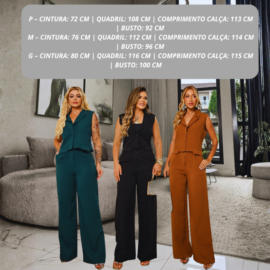 ✔ Não cria bolinhas e não gruda pelos ✔ Costura altamente reforçada ✔ Possui uma ótima elasticidade se ajustando ao corpo ✔ Não desbota ✔ Alta durabilidade ✔ Zero transparência O colete possui decote em V com gola lapela e fechamento frontal por botão único, trazendo um toque moderno e refinado. A calça tem modelagem pantalona, com cintura média e caimento fluido, que alonga a silhueta e valoriza o corpo. P– Cintura: 72 cm | Quadril: 108 cm | Comprimento calça: 113 cm | Busto: 92 cm M – Cintura: 76 cm | Quadril: 112 cm | Comprimento calça: 114 cm | Busto: 96 cm G – Cintura: 80 cm | Quadril: 116 cm | Comprimento calça: 115 cm | Busto: 100 cm