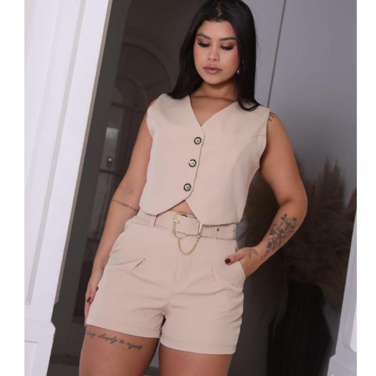 Conjunto Alfaiataria Feminino Elegante Cintura Alta com Cinto Dourado - Short + Colete Premium