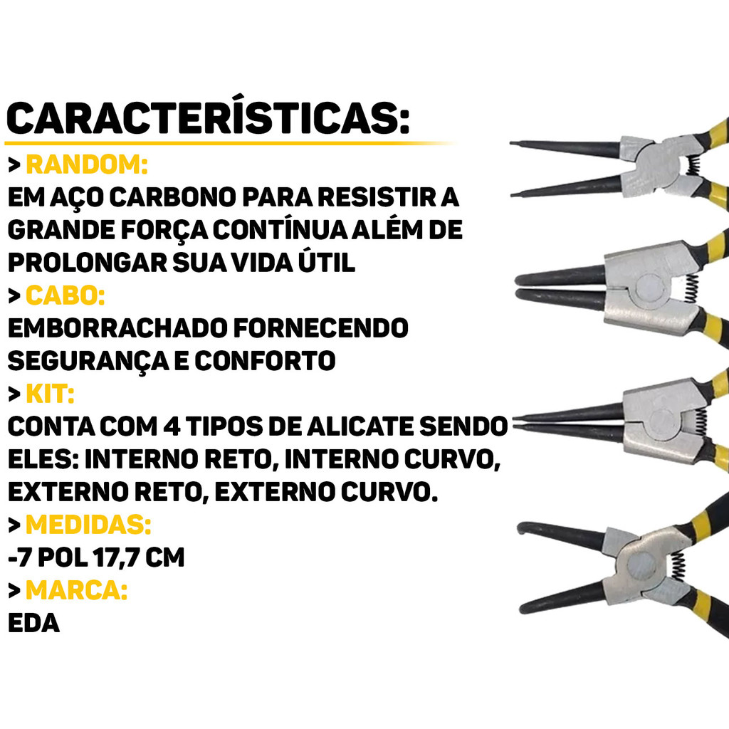 Alicate Para Anéis Jogo Com 4 Peças Eda O Jogo de Alicates Eda são ferramentas ideais para quem busca precisão e praticidade no manuseio de anéis e peças pequenas. É composto por quatro alicates diferentes, cada um projetado para uma função específica. Possuem tamanhos compactos e pontas finas que permitem trabalhar com detalhes delicados, proporcionando um trabalho mais eficiente e sem danos às peças. Características: > Duráveis e resistentes; > Produzidos em aço carbono de alta qualidade; > Ideal para abrir, fechar, ajustar ou remover anéis; > Indicado para anéis de retenção externos e internos; > O punho dos alicates é antiderrapante e resistente ao desgaste, tornando-o mais seguro de usar. Especificações Técnicas: > Material: aço; > O kit acompanha: - 1 alicate para anéis internos bico reto de 7”; - 1 alicate para anéis externos bico reto de 7”; - 1 alicate para anéis internos bico curvo de 7”; - 1 alicate para anéis externos bico curvo de 7”. - Marca: Eda - Garantia: 90 dias contra defeitos de fabricação Vantagens de comprar na Brester: - Produto a pronta entrega. - Produto novo, com garantia de fábrica. - Nota fiscal para Pessoa Física e Pessoa Jurídica.