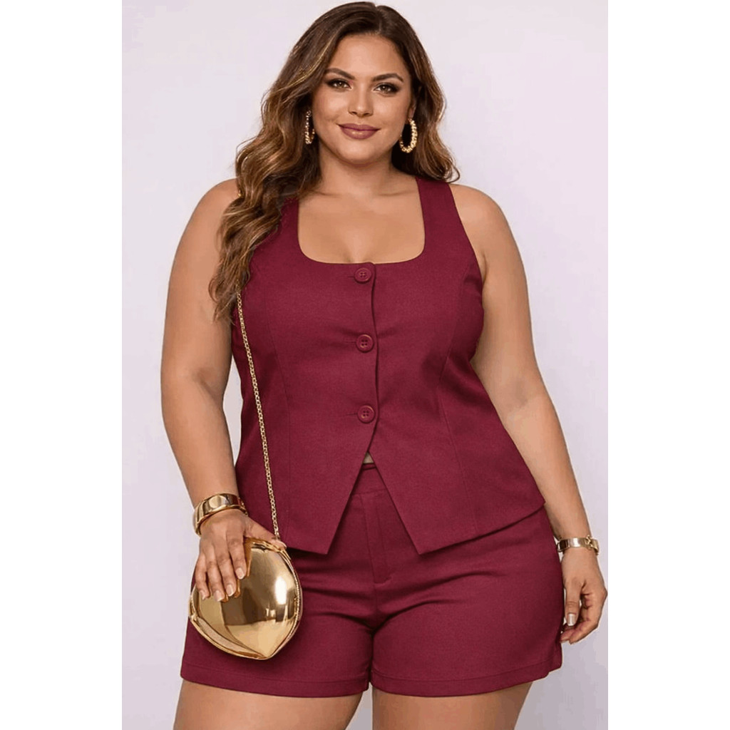 Conjunto Ana Alfaiataria Plus Size e Slim Colete com Botões e Short com Zíper Moda Casual Verão Look Moda Mulher Verão