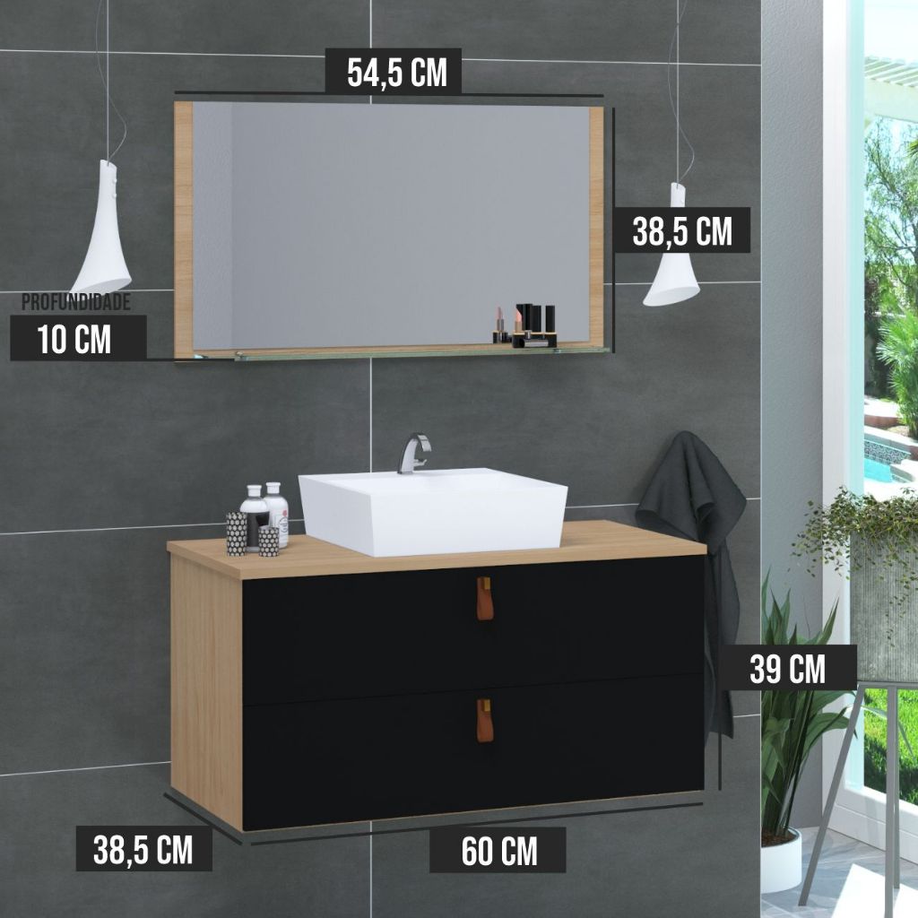 O Gabinete Berlim 60 oferece um design moderno, com seus componentes fabricados em MDF. Este modelo é ideal para quem quer economizar sem deixar de adquirir artigos de luxo. Sua estética moderna e luxuosa oferece qualidade, resistência e praticidade. Inclui: gabinete, pia e espelheira. Somos Fabricantes Possuímos variações de cores para o conjunto! PRODUTO TOTALMENTE RESISTENTE A ÚMIDADE E RESPINGOS DE ÁGUA! O MDF é preparado com várias camadas de fundo preparador (prime) seguido de várias camadas de tinta com secagem imediata em câmaras de luzes, garantindo uma grossa camada de material sobre a madeira, tornando-a resistente. Produto: A confecção é 100% em MDF e o recorte é realizados com maquinários de última geração, garantindo um corte milimétrico e preciso para uma estrutura e acabamento de qualidade. Decoração sofisticada: Em meio aos diversos benefícios de se ter um gabinete em seu banheiro, a principal é ter um ambiente completo, melhor decorado e mais sofisticado, elevando o nível da decoração do seu banheiro. Ferragens anticorrosivo: As ferragens possuem material resistente, que não enferrujam mesmo em contato com água. Ótima durabilidade, tendo eficiência ao abrir e fechar por um longo tempo. Mais organização: Seus itens de uso diários organizados e melhor acondicionados em espaços próprios para serem guardados GABINETE Comprimento: 60cm Altura: 39cm Profundidade: 38,5cm Descrição: Medidas ESPELHEIRA : comp. 55cm, alt. 38,5cm e prof. 10cm TAMANHO DA CUBA: : comprimento: 35cm Profundidade: 35CM altura: 11cm Material da PIA: MÁRMORE SINTÉTICO Puxador moderno em couro sintético, dando estilo e elegância ao seu banheiro Tipo de Dobradiça: Metálica. Material do Puxador da Porta: couro sintético Possui Portas: 02. É enviado montado: Sim. FURO para Torneira: SIM FURO para a Cuba: SIM Válvula da cuba: NÃO ESTÁ INCLUSO! Diâmetro Válvula Cuba: 3,2cm Espelheira: INCLUSA Espelho: INCLUSO Tipo de abertura da porta: ABRIR Fechamento da porta: COMUM Montagem: PRODUTO JÁ MONTADO! Manual montagem: NÃO INCLUI – JÁ VAI MONTADO! Instalação: NÃO INCLUI PARAFUSOS E BUCHAS PRODUTO VAI MONTADO!! (Não requer montagem, apenas instalação no local desejado) INSTALAÇÃO: Recomendamos parafusos e buchas número 08. A fixação do produto é muito simples. NÃO enviamos os parafusos e buchas para instalação. INSTRUÇÕES LIMPEZA: A limpeza deve ser feita com pano úmido e liso. Não utilizar materiais ásperos ou jatos de água diretamente sob o produto. MADEIRA DE REFLORESTAMENTO! CERTIFICAÇÃO DE RECURSOS NATURAIS. DESTAQUE: Resistente a umidade e impacto. Decoração sofisticada. NÃO INCLUI ACESSÓRIOS COMO CIFÃO, VÁLVULAS, PARAFUSOS E BUCHAS PARA INSTALAÇÃO. NÃO INCLUI A TORNEIRA! ATENÇÃO: Produto acompanha cuba e espelheira (com espelho) FIXAÇÃO DO PRODUTO MUITO SIMPLES! COM APENAS 2 PARAFUSOS E BUCHAS JÁ É POSSÍVEL FIXA-LO NA PAREDE. Qualquer dúvida basta nos chamar que algum de nossos atendentes estará à disposição. Não perca a oportunidade e compre direto do fabricante! Garantia do vendedor: 3 meses