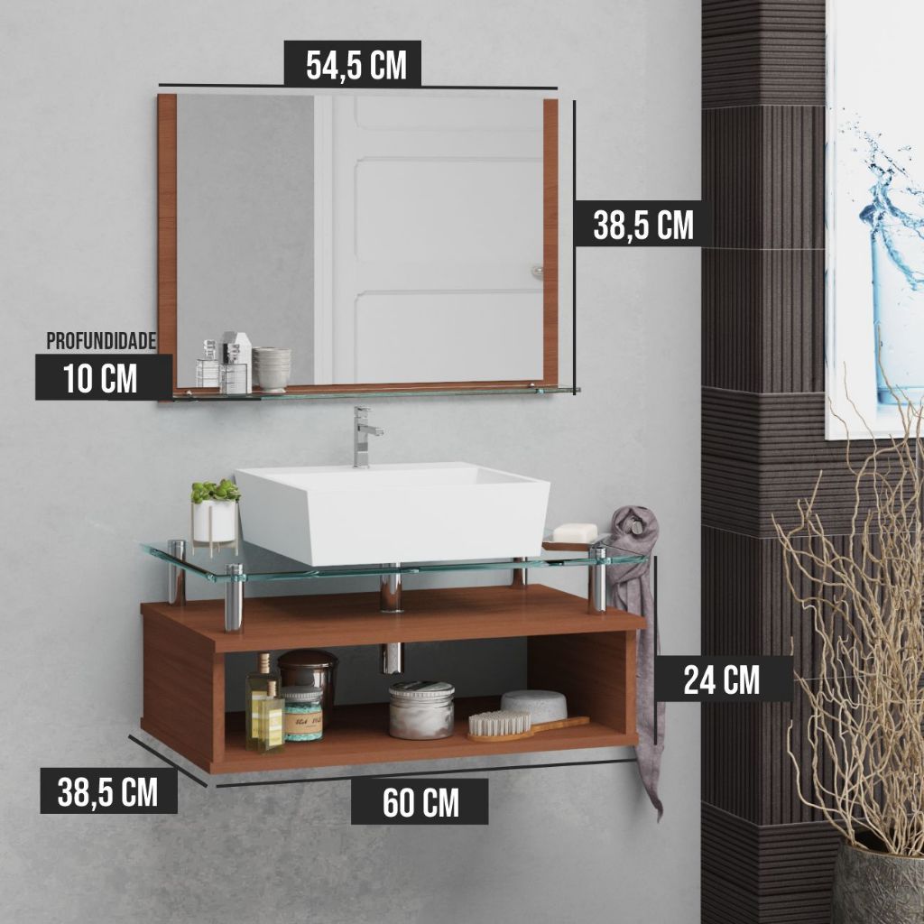 Conjunto Armário de Banheiro Jade 60cm MDF + Espelheira + Cuba com Tampo de Vidro Temperado