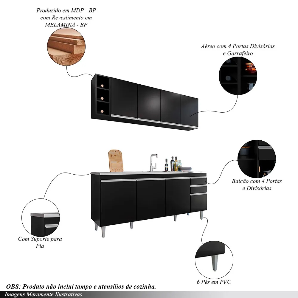 Conjunto Balcão de Cozinha para Pia Apex Armário Aéreo MDP/BP Preto G96 - Gran Belo
