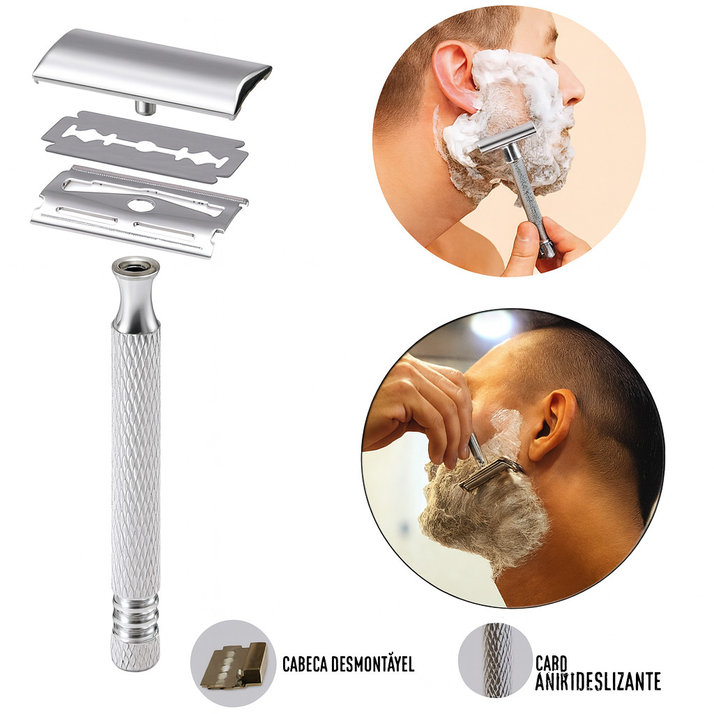 O Kit de Barbear Clássico AlfaCell é a escolha ideal para quem busca um barbear preciso, confortável e tradicional. Com design retrô e acabamento de alta qualidade, o conjunto combina praticidade, durabilidade e estilo, proporcionando uma experiência de barbear suave e profissional no conforto da sua casa. A navalha metálica com cabo texturizado garante firmeza e segurança durante o uso, evitando escorregões mesmo com as mãos molhadas. O pincel de cerdas macias ajuda a espalhar o creme de barbear de forma uniforme, amaciando os pelos e preparando a pele para um corte mais rente e confortável.O kit acompanha também duas lâminas de reposição de alto desempenho, oferecendo cortes limpos e eficientes. Ideal tanto para uso doméstico quanto profissional, o Kit AlfaCell é um item indispensável para quem aprecia o verdadeiro ritual do barbear clássico. ⚙️ Características Principais: Modelo: Kit de Barbear Clássico AlfaCell Inclui navalhete metálico cromado, pincel e 2 lâminas de reposição Navalhete com cabo antiderrapante e design ergonômico Pincel com cerdas macias e resistentes Lâminas de aço inoxidável com corte preciso Ideal para barbear tradicional com espuma ou sabonete Acabamento elegante e durável Fácil de limpar e reutilizar Perfeito para uso pessoal ou presente Conteúdo da Embalagem: 1 Navalhete metálico 1 Pincel de barbear 2 Lâminas de reposição Destaques do Produto: Barbear clássico e suave Materiais de alta durabilidade Estilo retrô e elegante Prático e fácil de usar Ideal para presentear homens exigentes Especificações Técnicas: Material do navalhete: Metal cromado Material do pincel: Plástico e cerdas sintéticas Tipo de lâmina: Aço inox Cor: Prata e bege Uso: Doméstico e profissional