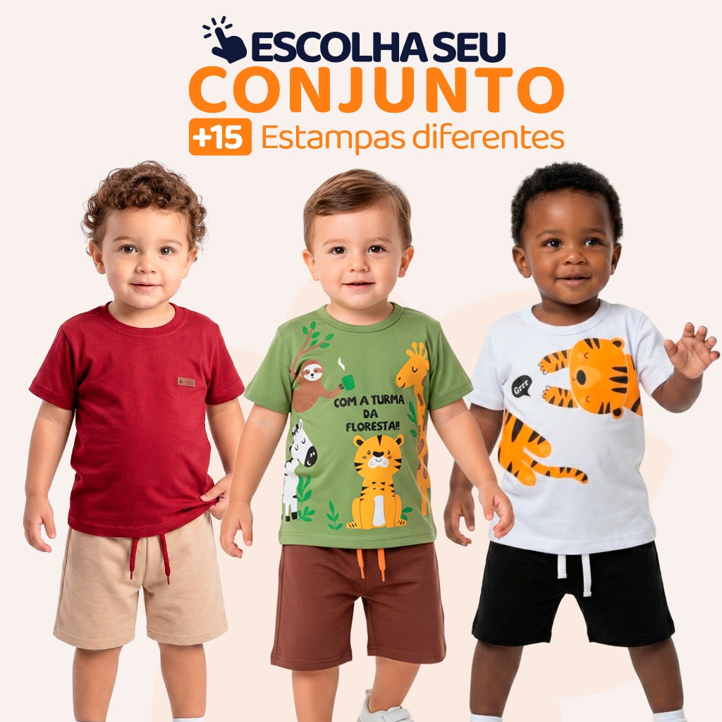 Conjunto Infantil Masculino – Camiseta ou Regata + Bermuda Estilo, conforto e liberdade para o dia a dia Conjunto infantil composto por: -1 camiseta ou regata (escolha o modelo) -1 bermuda moletinho As peças são ideais para o uso diário, seja na escola, passeios ou momentos de lazer. A malha leve e a bermuda com elástico confortável garantem liberdade para brincar com muito conforto. Detalhes do Produto -Camisetas e regatas em meia malha 100% algodão -Gola redonda com reforço de ombro -Bermudas em moletinho com no mínimo 85% algodão -Elástico na cintura com ajuste confortável -Modelos variados – escolha o conjunto desejado Tabela de Medidas – Camiseta/Regata Tam 1 – Busto 27 cm | Comprimento 36 cm | Tam 2 – Busto 28 cm | Comprimento 38 cm | Tam 3 – Busto 29 cm | Comprimento 40 cm | Tam 4 – Busto 31 cm | Comprimento 46 cm | Tam 6 – Busto 33 cm | Comprimento 48 cm | Tam 8 – Busto 34 cm | Comprimento 49 cm | Tam 10 – Busto 36 cm | Comprimento 53 cm | Bermuda Moletinho Tam 1 – Cintura 20 cm | Comprimento 26 cm Tam 2 – Cintura 21 cm | Comprimento 27 cm Tam 3 – Cintura 21 cm | Comprimento 28 cm Tam 4 – Cintura 22 cm | Comprimento 32 cm Tam 6 – Cintura 23 cm | Comprimento 35 cm Tam 8 – Cintura 24 cm | Comprimento 36 cm Tam 10 – Cintura 25 cm | Comprimento 38 cm Pode haver pequena variação nas medidas devido ao processo de confecção. Vantagens do Produto Peças leves, frescas e respiráveis Conforto ideal para o verão e dias quentes Modelos fáceis de vestir e combinar Ótima durabilidade e acabamento Dica: Adicione mais de um modelo ao carrinho e aproveite o mesmo frete para montar o kit ideal para o seu filho. Perguntas Frequentes 1. Posso escolher o conjunto? Sim. Basta selecionar a estampa e o tamanho desejado no momento da compra. 2. As peças são fresquinhas? Sim. A camiseta ou regata é feita em malha 100% algodão, ideal para dias quentes. 3. A bermuda tem elástico? Sim. Todas as bermudas têm elástico confortável e macio na cintura.