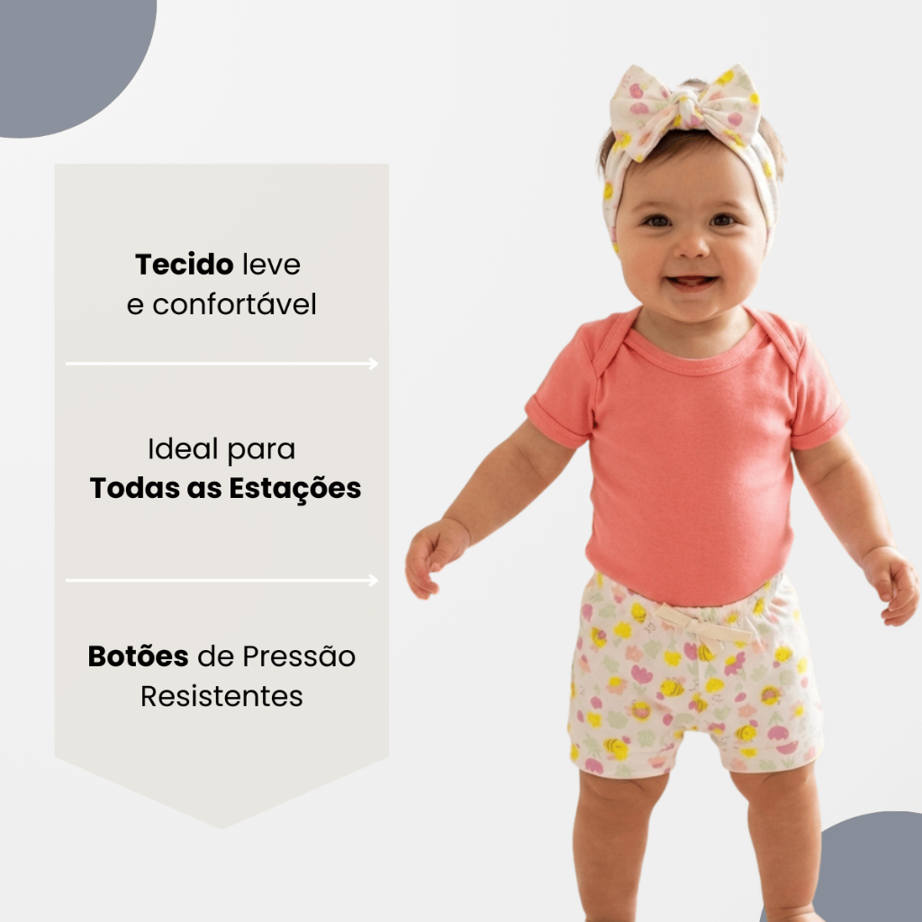 Conjunto Bebê Menina 3 Peças Kit Body Manga Curta Short Estampado Tiara Laço Cabelo Recém Nascido
