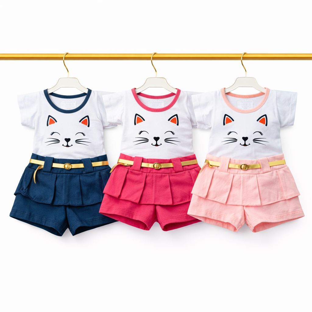 Conjunto Bebê Menina delicado e confortável, ideal para o dia a dia e ocasiões especiais. Desenvolvido pensando no bem-estar da bebê, com tecido macio, leve e respirável, perfeito para climas quentes. A Blusinha possui estampa fofa de gatinha, mangas curtas e acabamento suave que não irrita a pele. O Shorts saia tem ótimo caimento, elástico confortável na cintura e detalhe com cinto decorativo que deixa o visual ainda mais charmoso. Modelo prático, fácil de vestir e combinar, garantindo liberdade de movimento para a bebê brincar com conforto o dia todo. Não desbota, não encolhe e mantém a aparência bonita mesmo após várias lavagens. Ideal para passeios, festas, uso diário, presentear ou montar looks lindos para fotos. Produto de excelente qualidade, acabamento caprichado e ótimo custo-benefício — escolha certeira para quem busca conforto, beleza e durabilidade na moda bebê menina.