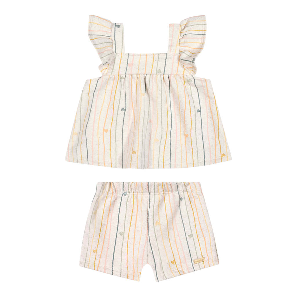 O Conjunto Colorittá é composto por blusa e short em moletom eco linho. A blusa possui alças com babados delicados e recorte franzido, garantindo volume e movimento à peça. Já o short conta com elástico no cós para proporcionar liberdade de movimentos. A estampa listrada em tons suaves tem pequenos corações e traz charme ao visual, sendo ideal para passeios ao ar livre e momentos de lazer. Aposte nesse conjunto encantador para garantir conforto e estilo para as meninas aproveitarem cada momento!Detalhes da peça: • Conjunto composto por blusa e short • Feito em moletom eco linho • Possui alças com babados • Estampa listrada com pequenos corações • Elástico no cós • Ideal para passeios e momentos de lazer