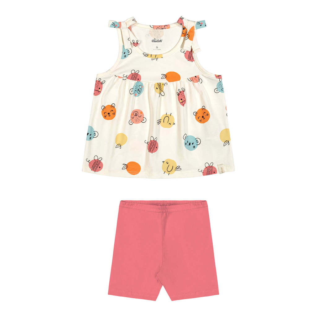 Trazendo um visual fofo com um toque de diversão, o Conjunto Elian é composto por regata e bermuda ciclista em cotton leve. A regata possui alças com detalhes em laços e recorte franzido na parte frontal, garantindo delicadeza à peça. Além disso, a estampa com uma releitura lúdica do clássico poá traz bichinhos e frutas, que dão um charme especial ao look. Já a bermuda ciclista conta com elástico no cós para mais conforto. Invista nesse visual incrível para aproveitar os dias de sol com estilo!Detalhes da peça: • Conjunto composto por regata e bermuda ciclista • Feito em cotton leve • Possui alças com laços • Possui estampa divertida de poá com bichinhos e frutas • Possui elástico no cós • Ideal para aproveitar dias de sol