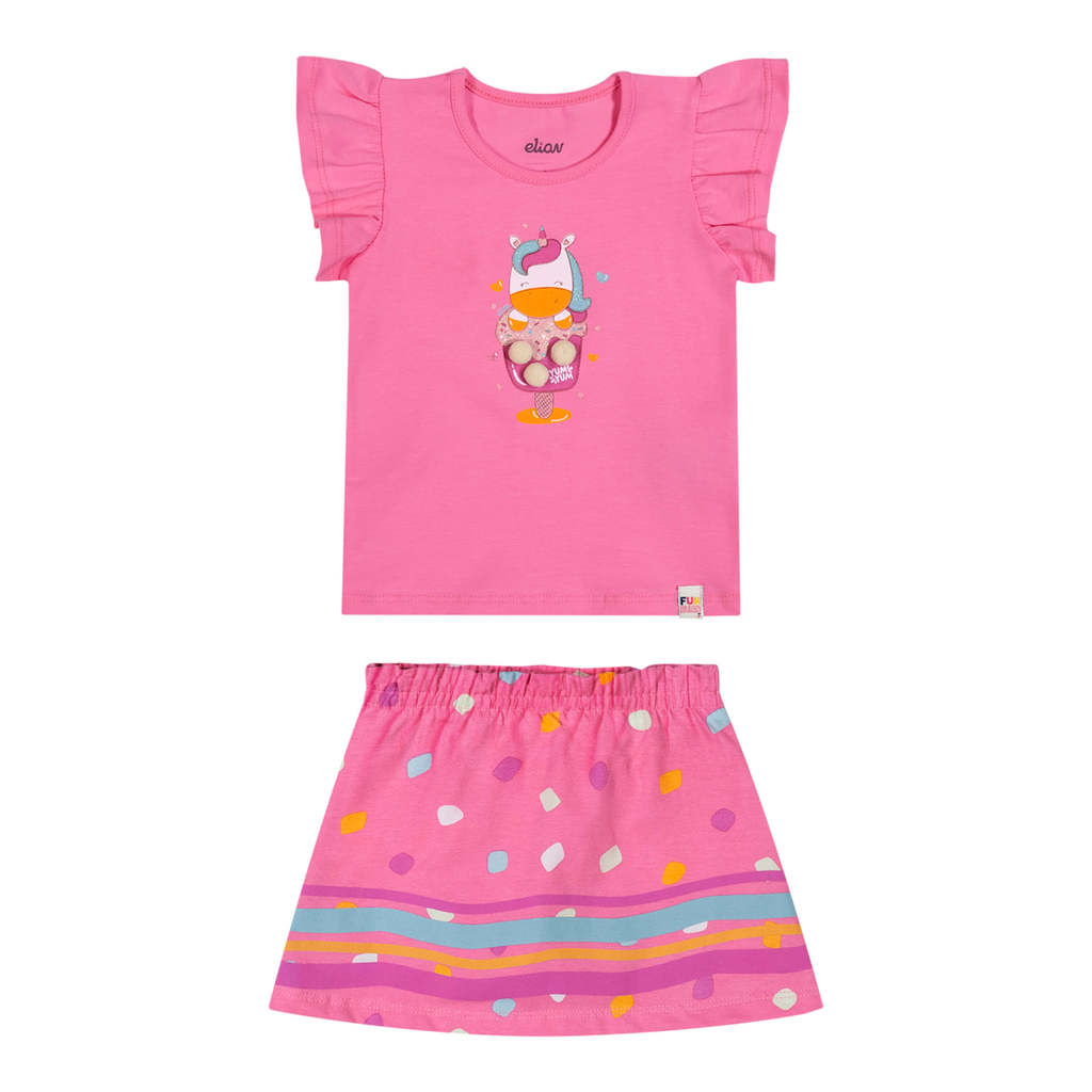 O Conjunto Elian, composto por blusa em cotton leve e saia em meia malha, é a escolha certa para um visual fofo e divertido! Sua blusa de mangas curtas possui uma linda estampa de unicórnio, trazendo detalhes em glitter e pompons, enquanto a saia conta com elástico no cós e short interno, proporcionando liberdade de movimentos. Ideal para um dia de passeio divertido, esse look completo é garantia de fofura. Aposte!Detalhes da peça: • Conjunto com blusa e saia • Feito em cotton leve e meia malha • Mangas curtas amplas • Estampa de unicórnio com glitter e pompons • Elástico no cós • Saia com short interno • Ideal para passeios divertidos