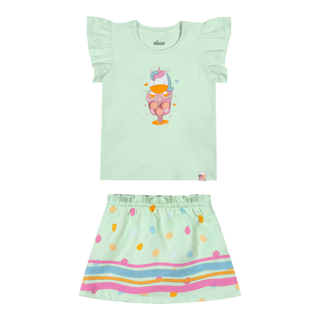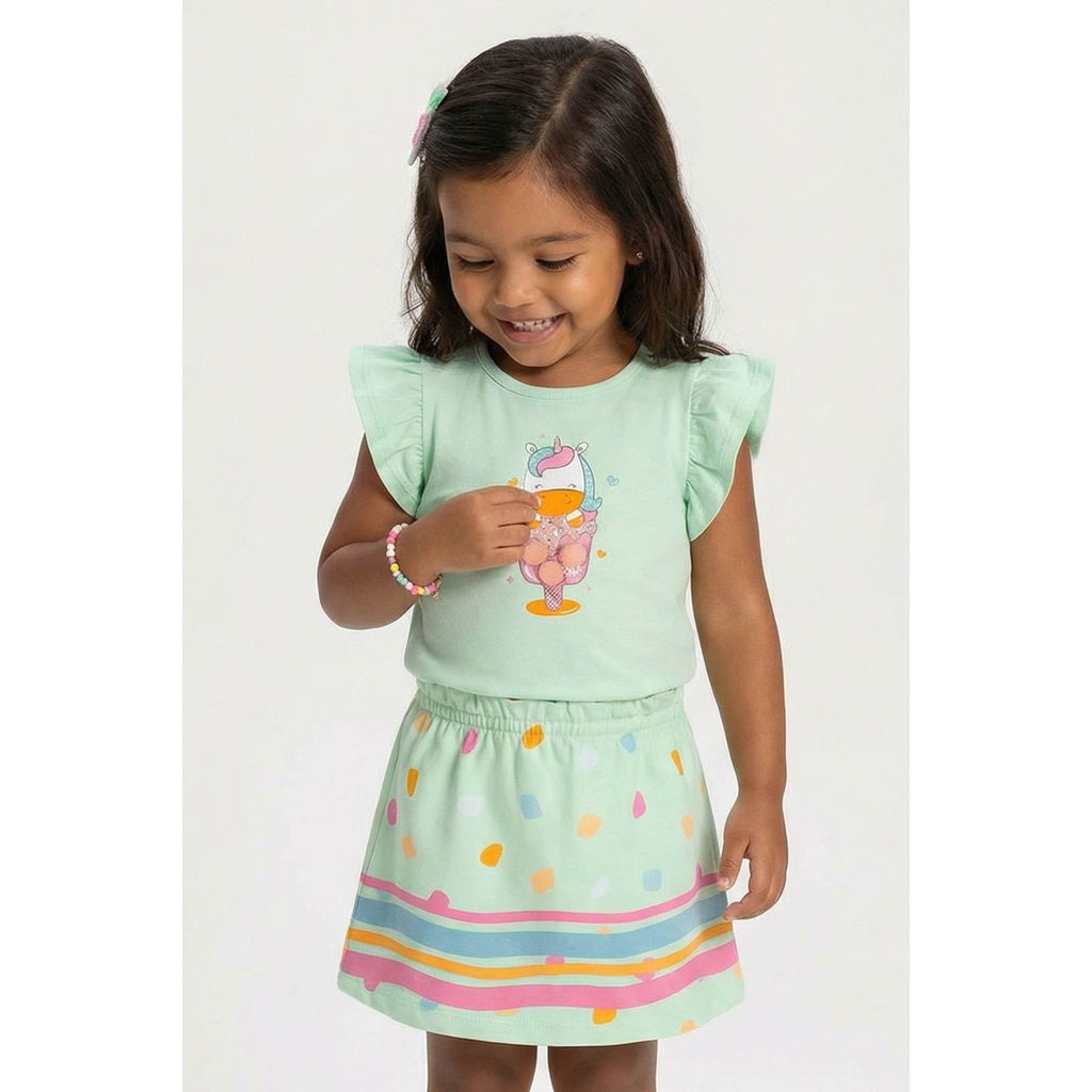 O Conjunto Elian, composto por blusa em cotton leve e saia em meia malha, é a escolha certa para um visual fofo e divertido! Sua blusa de mangas curtas possui uma linda estampa de unicórnio, trazendo detalhes em glitter e pompons, enquanto a saia conta com elástico no cós e short interno, proporcionando liberdade de movimentos. Ideal para um dia de passeio divertido, esse look completo é garantia de fofura. Aposte!Detalhes da peça: • Conjunto com blusa e saia • Feito em cotton leve e meia malha • Mangas curtas amplas • Estampa de unicórnio com glitter e pompons • Elástico no cós • Saia com short interno • Ideal para passeios divertidosModelo gerada por IA para fins ilustrativos. Em caso de dúvidas, considere a foto oficial sem modelo.