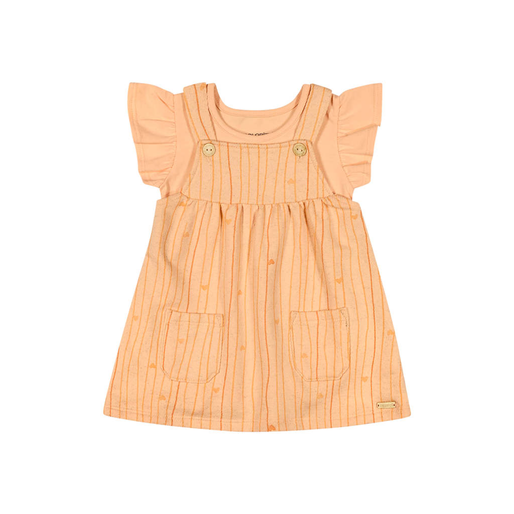 O Conjunto Colorittá é composto por body em cotton leve e vestido em moletom eco linho. O body possui mangas curtas franzidas e fechamento em botões de pressão entre as pernas, facilitando o vestir. Já o vestido é o destaque do look, trazendo uma delicada estampa listrada em tons suaves com pequenos corações. Além disso, a peça conta com alças com botões e bolsos frontais. Ideal para um passeio em família ou uma ocasião especial, é uma opção charmosa e versátil para brilhar em qualquer momento!Detalhes da peça: • Conjunto composto por body e vestido • Feito em cotton leve e moletom eco linho • Body com mangas curtas franzidas e botões de pressão • Vestido com alças e bolsos frontais • Estampa listrada com pequenos corações • Ideal para passeios e ocasiões especiais