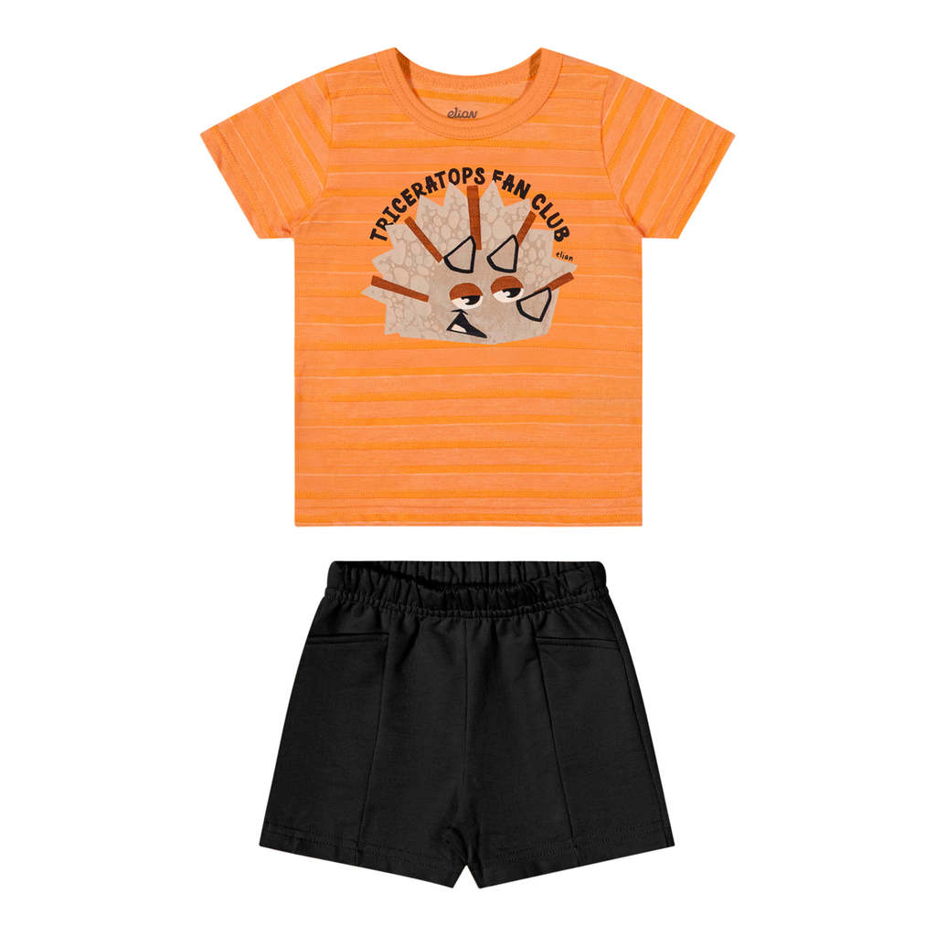 O Conjunto Elian é composto por camiseta em malha rajada e bermuda em moletinho. A camiseta de mangas curtas possui textura diferenciada e estampa divertida de um dinossauro com a frase “Triceratops Fan Club” (Fã Clube Triceratops), além de detalhes em efeito puff, garantindo um toque lúdico para a peça. Já a bermuda conta com elástico no cós e recortes frontais imitando bolsos. Ideal para brincadeiras e aventuras, aposte nesse visual criativo e estiloso para um dia a dia cheio de diversão!Detalhes da peça: • Conjunto composto por camiseta e bermuda • Feito em malha rajada e moletinho • Estampa de dinossauros • Elástico no cós • Ideal para brincadeiras e aventuras