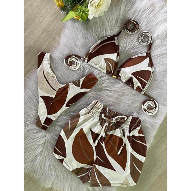 Conjunto Biquíni Cortininha + Shortinho | Look Feminino Praia Verão Colorido Marrom