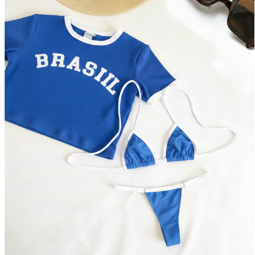 Conjunto Blusa feminina Cropped + Biquíni Brasil Moda Praia Verão Blogueira Alta Qualidade