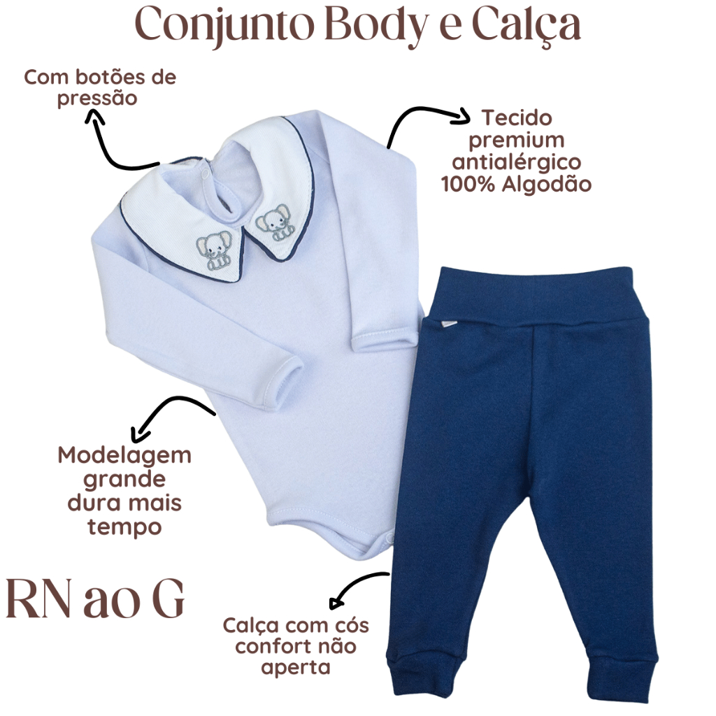 Conjunto Body e Calça Bebê Menino Elefante Marinho Suedine 100% Algodão Bory Masculino Gola Bordada