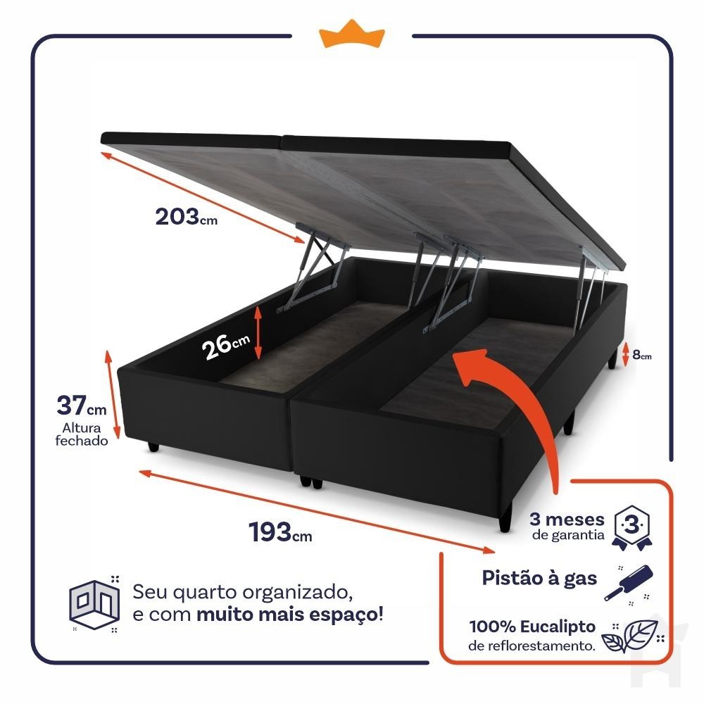 Dica Importante Gostou do produto, mas o tamanho não se encaixa à sua necessidade? Não tem problema, o Conjunto Cama Box Baú Liverpool está disponível em 5 medidas com 4 variações de cores nos box baú para que se adapte a qualquer ambiente. Nada melhor do que dormir confortavelmente, seja sozinho ou com seu parceiro, com um amplo espaço e conforto, não é mesmo?! Medidas do Colchão: 88x188x35 cm, 96X203x35 cm, 138x188x35 cm, 158x198x72, 193x203x35 cm. Medidas Colchão + Box: 88x188x80 cm, 96X203x80 cm, 138x188x80 cm, 158x198x80 cm, 193x203x80 cm. Cores do Colchão: Bege; Cores do Box Baú: Branco PU, Cinza, Marrom e Preto. Caso você tenha interesse em visualizar os anúncios de alguma das opções acima, basta efetuar uma busca de acordo com as opções descritas. Introdução ao Produto: Sabe aquela sensação de felicidade e satisfação que você sente quando faz uma boa escolha?! Pois bem, essa é a sensação de comprar um Conjunto Cama Box Baú Liverpool. Um produto moderno com design elegante, que irá transformar para sempre suas noites de sono :) A cama box com baú é solução ideal para ambientes com pouco espaço, pois oferece o suporte necessário ao colchão, além de contar com um espaço extra para armazenar objetos como acessórios, travesseiros e roupas de cama aproveitando o máximo do seu espaço interno e também poupar + espaço nos armários ;) O Colchão Liverpool é feito com os mais nobres materiais em sua composição, ele conta com espuma D40 e molas ensacadas. Por ser mais macio, o colchão de molas ensacadas individualmente traz benefícios e ajuda no alinhamento da coluna. O colchão King House acomoda melhor o contorno do corpo, dispondo de forma correta quadris e ombros, expulsando as dores e problemas de coluna. Não perca mais tempo e garanta já o seu colchão Liverpool! Características: - Espuma D40; - 201 molas por m2 ensacadas individualmente; - Suporta até 120 kg por pessoa. Características do Box Baú: - 100% eucalipto; - 28 cm de altura interna; - Sistema de abertura por Amortecedores - Pés com 8 cm de altura; Dimensões: - Altura: 35 cm (colchão) + 37 cm (box baú) + 8 cm (pés) = 80 cm de altura; - Largura : 193 cm; - Comprimento: 203 cm. Conteúdo da embalagem: - 01 Colchão King Size Liverpool Bege; - 02 Box Baú - 01 Kit Pés de PVC - 01 Certificado de garantia. - 01 Manual de montagem. Garantia: 1 ano de garantia nas molas, 1 ano de garantia nas espumas e 3 meses no revestimento. Informações Relevantes: - É imprescindível ter ciência de que é possível que haja divergência de tonalidade nos tecidos devido às variações de configurações de monitores/telas e lotes do fornecedor; - Não nos responsabilizamos pelo transporte por escadas, elevadores, guincho ou içamento deste produto, qualquer despesa é de responsabilidade do cliente; - Verifique as dimensões do produto, certificando-se de que o mesmo possa ser transportado por portas, corredores e elevadores; - Os objetos que decoram a imagem, não acompanham o produto; - Não nos responsabilizamos pela instalação e montagem; - Prestamos assistência somente por defeitos de fabricação. Nosso produto é certificado pelo INMETRO! CERTIFICADO DE CONFORMIDADE NÚMERO: 07424-001-02/2019 OCP: 003