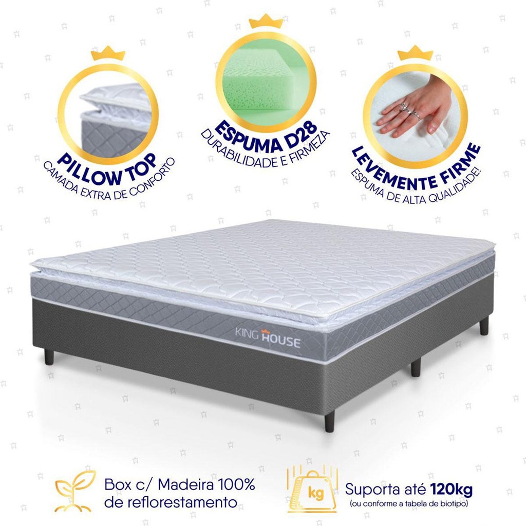 Dica Importante Gostou do produto, mas o tamanho não se encaixa à sua necessidade? Não tem problema, o Conjunto Box Durban está disponível em 6 larguras diferentes para que se adapte a qualquer ambiente. Nada melhor do que dormir confortavelmente, seja sozinho ou com seu parceiro, com um amplo espaço e conforto, não é mesmo?! Medidas do Colchão: 88x188x45 cm, 96x203x45 cm, 128x188x45 cm, 138x188x45 cm, 158x198x45 cm, 193x203x45 cm. Medidas Colchão + Box: 88x188x57 cm, 96x203x57 cm, 128x188x57 cm, 138x188x57 cm, 158x198x57 cm, 193x203x57 cm. Cores do Colchão: Cinza; Azul; Cores do Box: Marrom, Preto, Cinza, Branco; Caso você tenha interesse em visualizar os anúncios de alguma das opções acima, basta efetuar uma busca de acordo com as opções descritas. Introdução ao Produto: Sabe aquela sensação de felicidade e satisfação que você sente quando faz uma boa escolha?! Pois bem, essa é a sensação de comprar um Conjunto Box Durban. Um produto moderno com design elegante, que irá transformar para sempre suas noites de sono :) Feito com os mais nobres materiais em sua composição, ele conta com espuma D28. O colchão Durban acomoda melhor o contorno do corpo, dispondo de forma correta quadris e ombros, expulsando as dores e problemas de coluna.Não perca mais tempo e garanta já o seu Conjunto Box Durban! Características: - Espuma D28; - Suporta até 110Kg por pessoa. Características do Box: - 100% eucalipto; - Pés com 12 cm de altura; Dimensões: - Altura: 45 cm (colchão) + 12 cm (box) = 57 cm de altura; - Largura : 138 cm; - Comprimento: 188 cm. Conteúdo da embalagem: - 1 Colchão Durban - 1 Box Cinza - Manual de Montagem - Certificado de Garantia - 6 Pés de PVC Garantia: 1 ano de garantia nas molas, 1 ano de garantia nas espumas e 3 meses no revestimento. Informações Relevantes: - É imprescindível ter ciência de que é possível que haja divergência de tonalidade nos tecidos devido às variações de configurações de monitores/telas e lotes do fornecedor; - Não nos responsabilizamos pelo transporte por escadas, elevadores, guincho ou içamento deste produto, qualquer despesa é de responsabilidade do cliente; - Verifique as dimensões do produto, certificando-se de que o mesmo possa ser transportado por portas, corredores e elevadores; - Os objetos que decoram a imagem, não acompanham o produto; - Não nos responsabilizamos pela instalação e montagem; - Prestamos assistência somente por defeitos de fabricação. Nosso produto é certificado pelo INMETRO! CERTIFICADO DE CONFORMIDADE NÚMERO: 07424-001-02/2019 OCP: 003