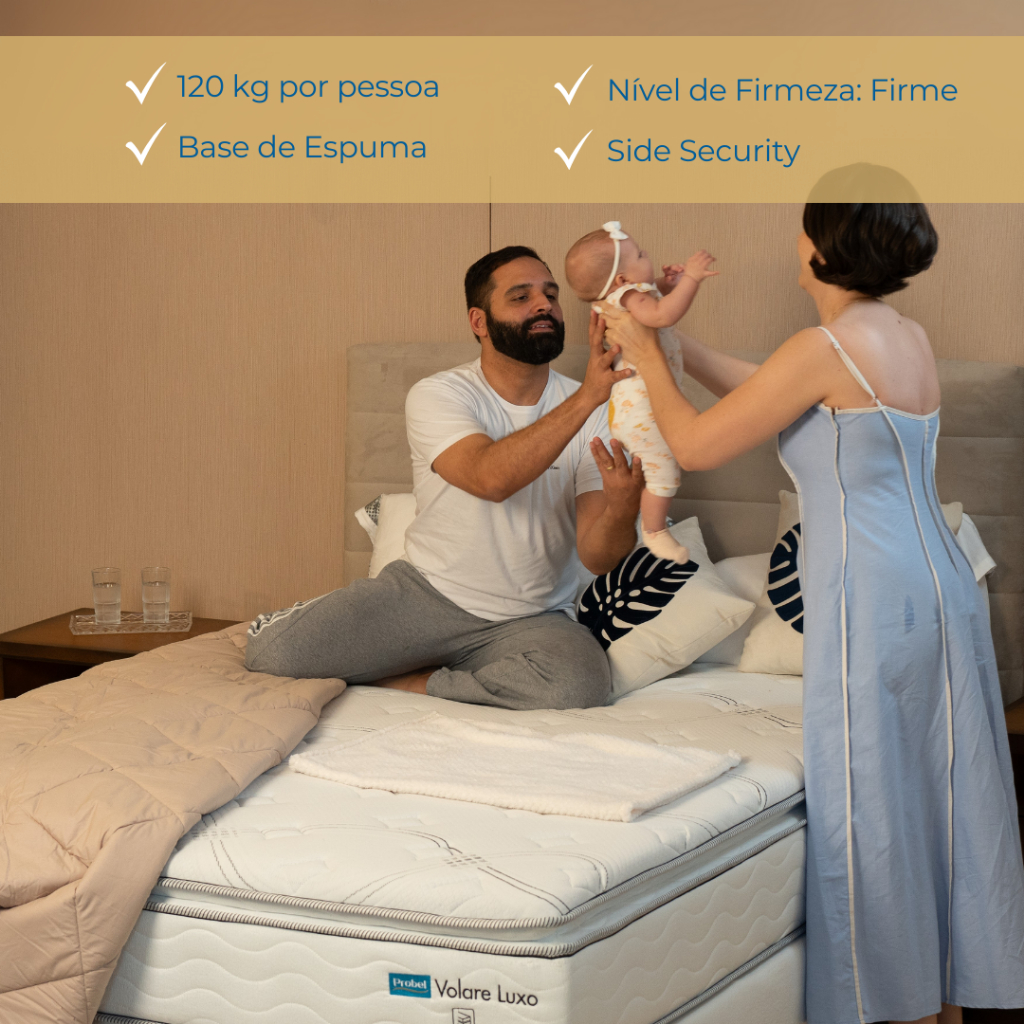 Conjunto Box Queen de Molas Prolastic Volare Luxo Probel Descubra o conforto e a qualidade do Conjunto Box que oferece excelente relação custo-benefício. Ideal para quem busca um Conjunto Box com firmeza firme, durável e acessível, o Volare Luxo combina tecnologia avançada e materiais de alta qualidade para proporcionar noites de sono reparadoras e saudáveis. Benefícios do Conjunto Box Volare Luxo: - Conforto Personalizado com Molas Prolastic: Esse sistema de molejo oferece suporte firme e adaptável, garantindo alinhamento adequado da coluna e minimizando a sensação de afundamento. Isso é especialmente benéfico para pessoas que dormem de costas ou de barriga, proporcionando suporte extra para a coluna e promovendo postura saudável durante o sono. - Nível de Conforto Firme para Suporte Adequado: É ideal para quem busca um Conjunto Box que ofereça suporte robusto e duradouro. Essa característica é essencial para quem precisa de suporte extra para a coluna, aliviando pontos de pressão e garantindo um sono profundo e reparador. - Indicado para Casais com Biotipos Parecidos e suporta até 120 kg por pessoa. Isso garante durabilidade e conforto para ambos, independentemente das diferenças de peso e altura. - Conforto Extra: O Pillow Super oferece uma camada adicional de conforto, proporcionando sensação de maciez ao deitar-se, sem comprometer o suporte necessário para uma boa noite de sono. Características Técnicas: Modelo : Volare Luxo Marca: Probel Pillow: Super Gramatura Tecido: 280 g/m² Espuma Matelassê: D20 Cilíndrica Espuma do Estofamento 1: D33 Espuma do Estofamento 2: Espuma de Alta Densidade ≥ D65 Sistema de Molejo: Prolastic Base de Suporte do Colchão: Espuma Nível de Firmeza: Firme Suporte de Peso: 120 kg por pessoa Manutenção: No turn Garantia: 12 Meses Altura do Colchão: 33 cm Altura da Base Box: 26 cm Altura dos Pés: 12 cm Altura do Conjunto: 71 cm Comprimento: 198 cm Largura: 158 cm Tamanho: Queen Indicação Biotipos Casais: Casais com biotipos parecidos Certificação Inmetro: Certificado conforme Portaria Inmetro Nº 75/2021 Garantia e Suporte A Probel oferece garantia de 12 meses a partir do recebimento do produto. Caso perceba algum defeito de fabricação, entre em contato com nossos canais de atendimento para análise rápida e eficiente. A Probel, conhecida por sua qualidade e confiança, é a escolha certa para quem busca conforto e durabilidade. O Conjunto Box Mola Prolastic Volare Luxo é a escolha perfeita para quem busca conforto, durabilidade e preço acessível. Com tecnologia avançada e materiais de alta qualidade, este Conjunto Box proporciona noites de sono reparadoras, garantindo um despertar revigorante todos os dias. Aproveite esta oportunidade e invista no seu bem-estar com o Conjunto Box Volare Luxo da Probel.