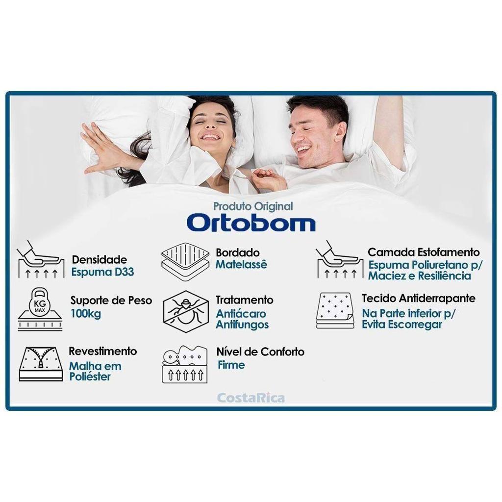 Conjunto Box Solteiro: Colchão Anatômico Ortobom D33 ISO 100 Ultra Firme+Base CRC Suede Preto (88x188) Abaixo segue os produtos que fazem parte desse KIT: COLCHÃO SOLTEIRO ORTOPÉDICO ORTOBOM D33 ISO 100 88X188X18 Marca: Ortobom Dimensões(Cm): Colchão Ortopédico D33 ISO 100 Comprimento(Profundidade): 188 cm Largura: 88 cm Altura: 18 cm Suporte de Peso: - 110 kg Espuma de Estofamento: - Alta Qualidade, D33 Nível de Firmeza do Colchão: - Firme Tipo de Estrutura Interna: - EPS Estrutura Bloco de Espuma: - EPS Densidade da Espuma: - D33 Tipo de Colchão: - Anatômico Benefícios Extras de Colchão: - Ecologicamente Correto Tecido com Tratamento: - Antiácaro e Antifungo Tipo do Bordado do Tecido: - Matelassê Características do Tecido: - Viscose Tipo de Forração do Revestimento Inferior: - Antiderrapante Tecido da Faixa Lateral: - Poliéster Modo de Utilização: - One Side Certificação de Qualidade: - INMETRO, INMETRO Nossa Avaliação: - Qualidade Muito Boa Tempo de Garantia: - 3 meses CAMA BOX SOLTEIRO COSTA RICA SUEDE BLACK 88X188X20 Marca: A Costa Rica Dimensões(Cm): Cama Box Suede Black Comprimento(Profundidade): 188 cm Largura: 88 cm Altura: 33 cm Características Interna Cama Box: - Estrutura de Madeira Forração Revestimento: - Tecido, Antiderrapante, Poliéster, Tecido de Alta Qualidade Cor do Revestimento Cama Box: - Preto Suporte de Peso da Cama Box: - 150 Kg Sobre os Pés para Cama Box: - Pés Fixos Madeira/ABS Altura dos pés da Cama Box: - 12cm Altura das Camas Box com os pés: - 32 cm altura Sobre a Cama Box: - Vantagens Tempo de Garantia da Cama Box: - 3 meses Certificação de Qualidade: - Selo Ecologicamente Correto, Garantia de Qualidade Costa Rica Nossa Avaliação da Cama Box: - Qualidade Muito Boa Imagens Meramente Ilustrativas. Não nos responsabilizamos pela montagem/instalação dos produtos. Todas as informações divulgadas são de responsabilidade exclusiva do fabricante/fornecedor. -Verifique com os fabricantes do produto e de seus componentes eventuais limitações à utilização de todos os recursos e funcionalidades - Confira as dimensões do produto e analise se irão passar normalmente por elevadores, portas, escadas e corredores, pois não nos responsabilizamos caso o produto necessite durante a entrega de: Desmontagem, subir escadas ou ser transportado por guincho, cordas para apartamentos. A entrega limita-se ao descarregamento em local que tenha e ofereça total facilidade de acesso normal; - Só fazemos entregas por transportes rodoviários. Não realizamos entregas por transportes fluviais, aéreos e outros diferente de rodoviário. Não realizamos entregas na região norte: Amapá, Amazonas, Pará, Roraima e Acre; - Temos áreas com restrição e dificuldades que os transportadores rodoviários não atendem. Área de difícil acesso, área de risco, área rural, áreas fluviais, estradas não pavimentadas; - Sendo assim, caso seu endereço esteja em área restrita de entrega, a retirada de sua compra deverá ser realizada no CD do transportador ou indicar no momento da compra um endereço entrega fora da área restrita; - Caso realize pedido com entregas em locais de difícil acesso ou áreas com restrição e dificuldades que os transportadores e proprio correios não atendem, a compra sera cancelada pela Costa Rica Colchões, com a devida comunicação e estorno do pagamento ao cliente.