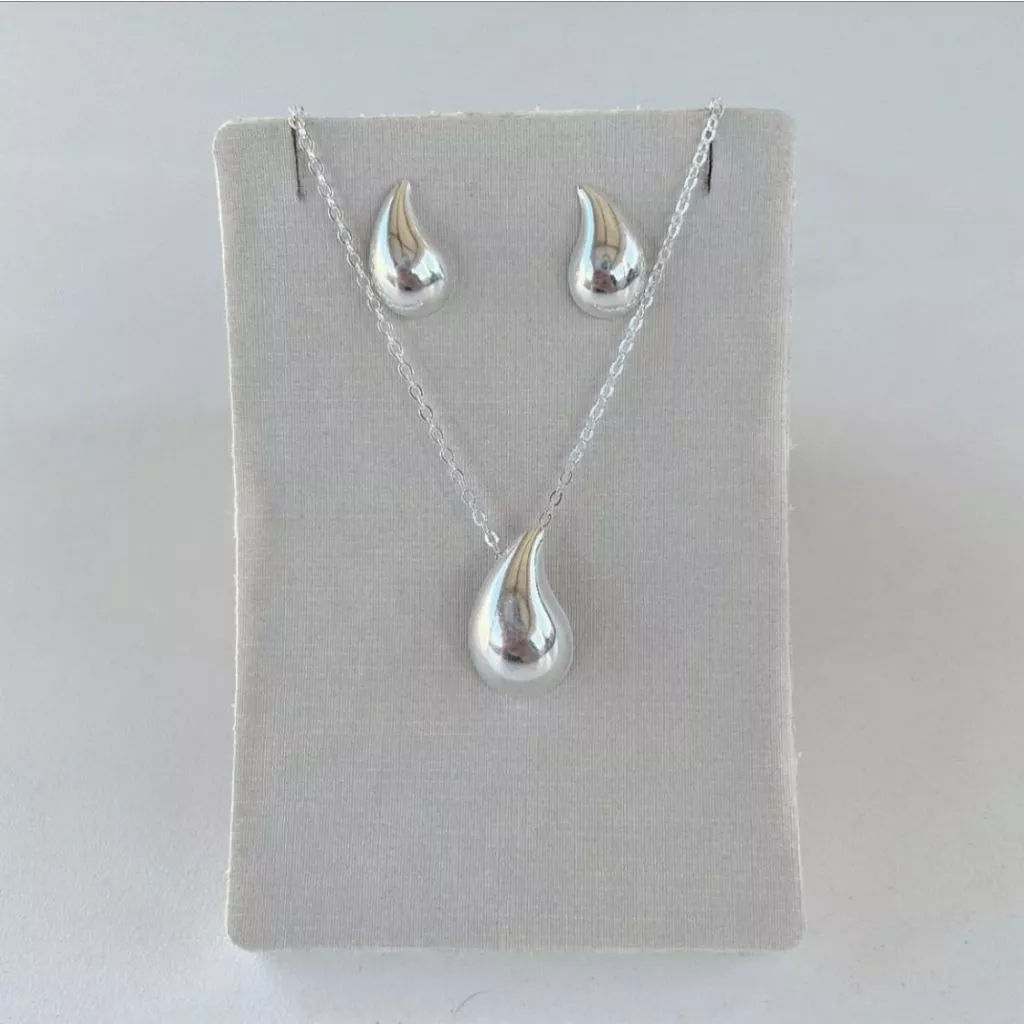 Conjunto Brinco e Colar Gota Virgula Feminino Folheado a Prata 925 e Ouro 18k
