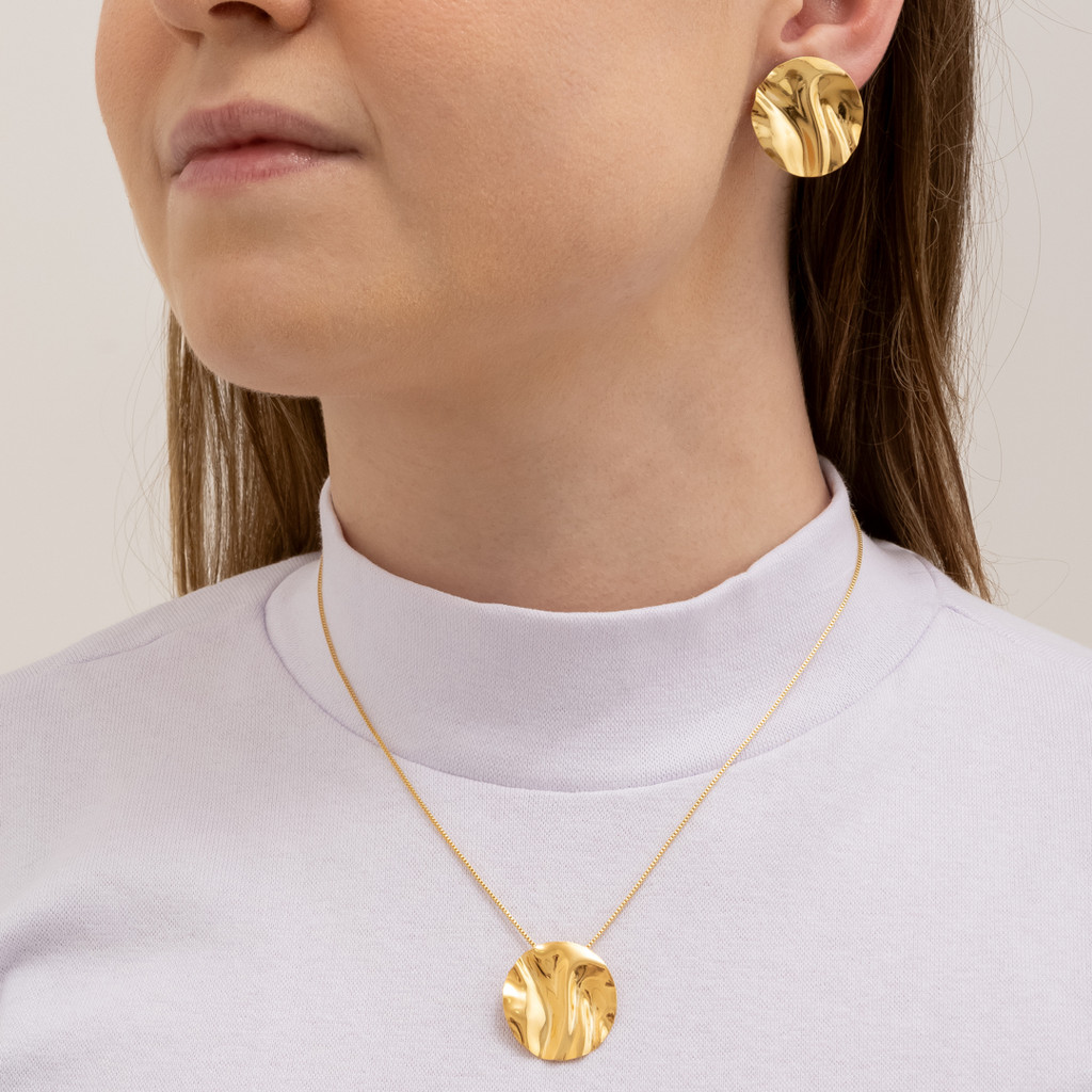 Conjunto Brinco e Colar Redondo Amassado Banhado a Ouro 18K - D France Semijóias