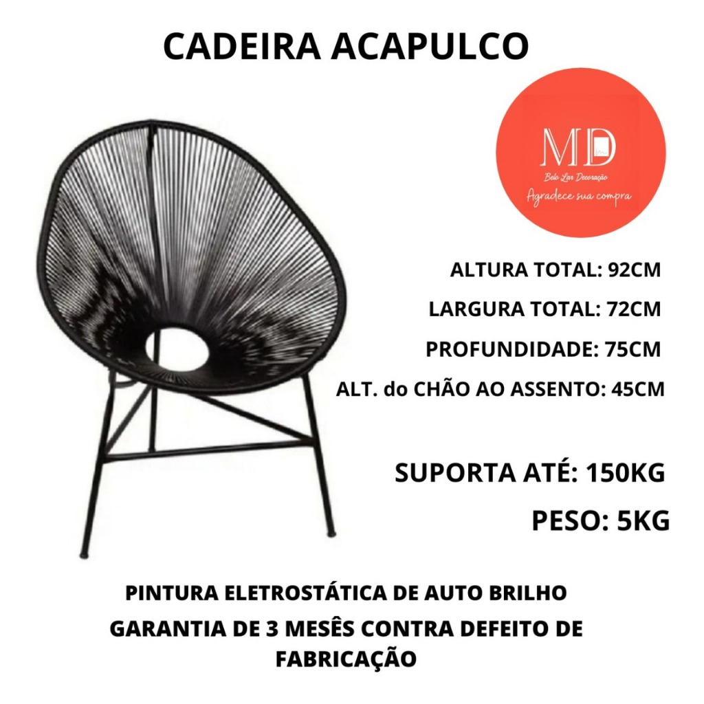 Cadeira Acapulco Modelo Confortável e bem estruturado Suporta até 150kg Garantia contra defeitos de Fabricação- 3 Meses *** CADEIRA DESMONTADA DE FACIL MONTAGEM *** **** Compras até 1 KITS peço a gentileza de fazer uma nova compra para evitar AVARIAS no transporte **** Cores disponíveis: Azul bic/ Azul Marinho/ Tiffany/ Palha/ Fendi/ Cinza/ Terracota/ Amarelo/ Musgo/ Preto/ Marrom/ Vermelho/ Pink/ Coral/ Branco/ Vinho. Especificações da Cadeira Acapulco: Estrutura de aço carbono- Acabamento em fibra sintética Com Proteção solar ( não estraga e não desbota ) Medidas da cadeira: 92cm de altura X 70cm de largura X 68cm de profundidade Produto fabricado em aço carbono, pintura eletrostática, fibra de primeira linha onde leva um estabilizante UV, para retardar a degradação quando exposto ao tempo (sol e chuva). Especificações da Mesinha Acapulco: Largura: 45 cm Altura: 65 cm Profundidade: 45cm **** Compras até 1 KITS peço a gentileza de fazer uma nova compra para evitar AVARIAS no transporte **** OBRIGADO POR ESCOLHER A MD. BELO LAR DECORAÇÃO, está localizada na cidade de Porto Ferreira - A CAPITAL DA CERÂMICA, somos uma loja on-line e temos diversos produtos diretamente da fábrica, produtos de qualidade para deixar o seu lar mais bonito e aconchegante. Conte com nosso rápido atendimento para poder lhe ajudar.