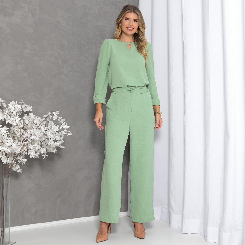Conjunto calça com bolso e com elastano , manga longa atras com botão
