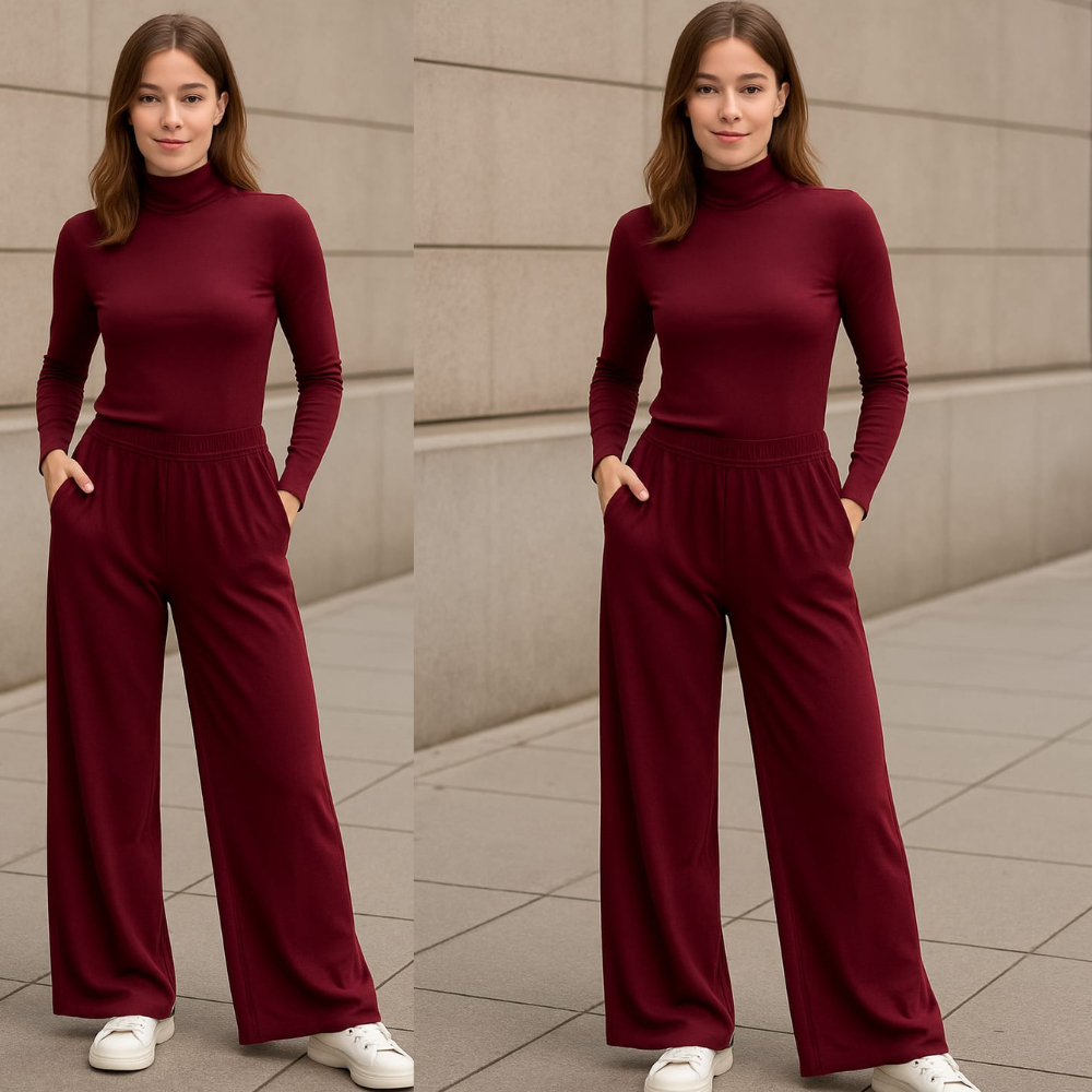 Conjunto Calça Pantalona Com Bolso nas Laterais e Blusa Feminina Estilosa Manga Longa Gola Alta Cacharrel em Viscolycra