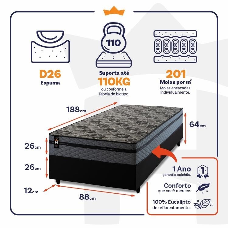 Dica Importante Gostou do produto, mas o tamanho não se encaixa à sua necessidade? Não tem problema, o Conjunto Cama Box Montreal está disponível em 5 medidas para que se adapte a qualquer ambiente. Nada melhor do que dormir confortavelmente, seja sozinho ou com seu parceiro, com um amplo espaço e conforto, não é mesmo?! Medidas do Colchão: 88x188x26 cm, 96X203x26 cm, 138x188x26 cm, 158x198x26 cm. Medidas Colchão + Box: 88x188x64 cm, 96X203x64 cm, 138x188x64 cm, 158x198x64 cm. Cores do Colchão: Cinza; Cores do Box: Branco PU, Cinza, Marrom e Preto. Caso você tenha interesse em visualizar os anúncios de alguma das opções acima, basta efetuar uma busca de acordo com as opções descritas. Introdução ao Produto: Sabe aquela sensação de felicidade e satisfação que você sente quando faz uma boa escolha?! Pois bem, essa é a sensação de comprar um Conjunto Cama Montreal. Um produto moderno com design elegante, que irá transformar para sempre suas noites de sono :) Feito com os mais nobres materiais em sua composição, ele conta com espuma D26 e molas ensacadas. Por ser mais macio, o colchão de molas ensacadas individualmente traz benefícios e ajuda no alinhamento da coluna. O colchão King House acomoda melhor o contorno do corpo, dispondo de forma correta quadris e ombros, expulsando as dores e problemas de coluna. Não perca mais tempo e garanta já o seu colchão Montreal! Características: - Espuma D26; - 201 molas por m2 ensacadas individualmente; - Suporta até 120 kg por pessoa. Características do Box: - 100% eucalipto; - Pés com 12 cm de altura; Dimensões: - Altura: 26 cm (colchão) + 26 cm (box) + 12 cm (pés) = 64 cm de altura; - Largura : 88 cm; - Comprimento: 188 cm. Conteúdo da embalagem: - 01 Colchão Solteiro Montreal Cinza; - 01 Box - 04 Pés de PVC - 01 Certificado de garantia. - 01 Manual de montagem. Garantia: 1 ano de garantia nas molas, 1 ano de garantia nas espumas e 3 meses no revestimento. Informações Relevantes: - É imprescindível ter ciência de que é possível que haja divergência de tonalidade nos tecidos devido às variações de configurações de monitores/telas e lotes do fornecedor; - Não nos responsabilizamos pelo transporte por escadas, elevadores, guincho ou içamento deste produto, qualquer despesa é de responsabilidade do cliente; - Verifique as dimensões do produto, certificando-se de que o mesmo possa ser transportado por portas, corredores e elevadores; - Os objetos que decoram a imagem, não acompanham o produto; - Não nos responsabilizamos pela instalação e montagem; - Prestamos assistência somente por defeitos de fabricação. Nosso produto é certificado pelo INMETRO! CERTIFICADO DE CONFORMIDADE NÚMERO: 07424-001-02/2019 OCP: 003