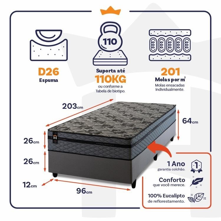 Dica Importante Gostou do produto, mas o tamanho não se encaixa à sua necessidade? Não tem problema, o Conjunto Cama Box Montreal está disponível em 5 medidas para que se adapte a qualquer ambiente. Nada melhor do que dormir confortavelmente, seja sozinho ou com seu parceiro, com um amplo espaço e conforto, não é mesmo?! Medidas do Colchão: 88x188x26 cm, 96X203x26 cm, 138x188x26 cm, 158x198x26 cm. Medidas Colchão + Box: 88x188x64 cm, 96X203x64 cm, 138x188x64 cm, 158x198x64 cm. Cores do Colchão: Cinza; Cores do Box: Branco PU, Cinza, Marrom e Preto. Caso você tenha interesse em visualizar os anúncios de alguma das opções acima, basta efetuar uma busca de acordo com as opções descritas. Introdução ao Produto: Sabe aquela sensação de felicidade e satisfação que você sente quando faz uma boa escolha?! Pois bem, essa é a sensação de comprar um Conjunto Cama Montreal. Um produto moderno com design elegante, que irá transformar para sempre suas noites de sono :) Feito com os mais nobres materiais em sua composição, ele conta com espuma D26 e molas ensacadas. Por ser mais macio, o colchão de molas ensacadas individualmente traz benefícios e ajuda no alinhamento da coluna. O colchão King House acomoda melhor o contorno do corpo, dispondo de forma correta quadris e ombros, expulsando as dores e problemas de coluna. Não perca mais tempo e garanta já o seu colchão Montreal! Características: - Espuma D26; - 201 molas por m2 ensacadas individualmente; - Suporta até 120 kg por pessoa. Características do Box: - 100% eucalipto; - Pés com 12 cm de altura; Dimensões: - Altura: 26 cm (colchão) + 26 cm (box) + 12 cm (pés) = 64 cm de altura; - Largura : 96 cm; - Comprimento: 203 cm. Conteúdo da embalagem: - 01 Colchão Solteiro Montreal Cinza; - 01 Box - 06 Pés de PVC - 01 Certificado de garantia. - 01 Manual de montagem. Garantia: 1 ano de garantia nas molas, 1 ano de garantia nas espumas e 3 meses no revestimento. Informações Relevantes: - É imprescindível ter ciência de que é possível que haja divergência de tonalidade nos tecidos devido às variações de configurações de monitores/telas e lotes do fornecedor; - Não nos responsabilizamos pelo transporte por escadas, elevadores, guincho ou içamento deste produto, qualquer despesa é de responsabilidade do cliente; - Verifique as dimensões do produto, certificando-se de que o mesmo possa ser transportado por portas, corredores e elevadores; - Os objetos que decoram a imagem, não acompanham o produto; - Não nos responsabilizamos pela instalação e montagem; - Prestamos assistência somente por defeitos de fabricação. Nosso produto é certificado pelo INMETRO! CERTIFICADO DE CONFORMIDADE NÚMERO: 07424-001-02/2019 OCP: 003
