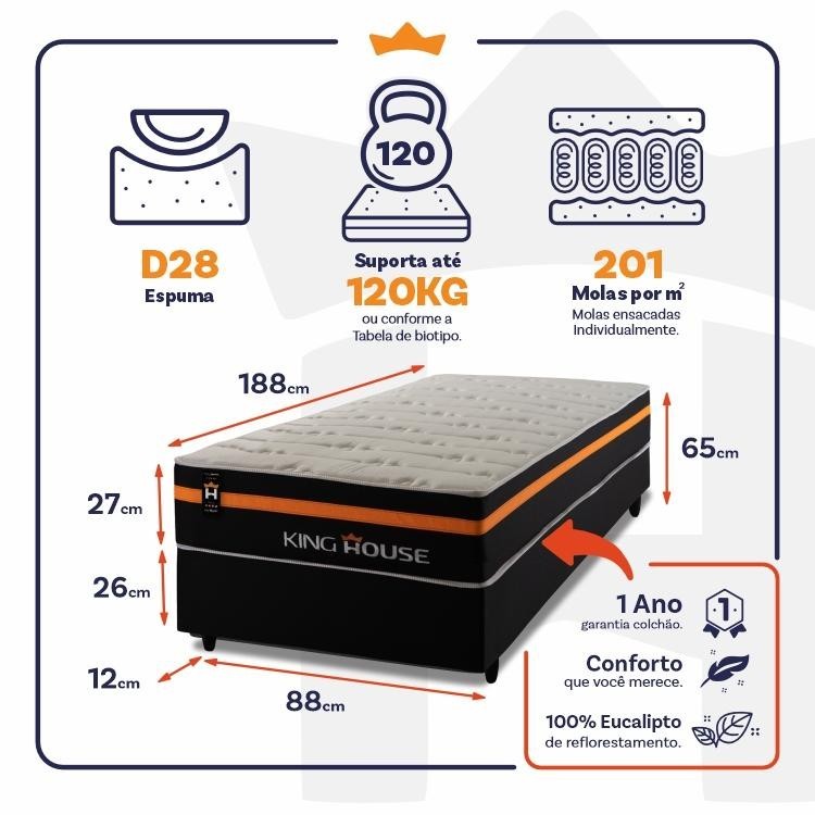 Dica Importante Gostou do produto, mas o tamanho não se encaixa à sua necessidade? Não tem problema, o Conjunto Cama Box Sirius está disponível em 5 medidas para que se adapte a qualquer ambiente. Nada melhor do que dormir confortavelmente, seja sozinho ou com seu parceiro, com um amplo espaço e conforto, não é mesmo?! Medidas do Colchão: 88x188x27 cm, 96X203x27 cm, 128x188x27 cm,138x188x27 cm, 158x198x27 cm, 193x203x27 cm. Medidas Colchão + Box: 88x188x65 cm, 96X203x65 cm, 138x188x65 cm, 158x198x65 cm, 193x203x65 cm. Cores do Colchão: Preto; Cores do Box: Branco PU, Cinza, Marrom e Preto. Caso você tenha interesse em visualizar os anúncios de alguma das opções acima, basta efetuar uma busca de acordo com as opções descritas. Introdução ao Produto: Sabe aquela sensação de felicidade e satisfação que você sente quando faz uma boa escolha?! Pois bem, essa é a sensação de comprar um Conjunto Cama Sirius. Um produto moderno com design elegante, que irá transformar para sempre suas noites de sono :) Feito com os mais nobres materiais em sua composição, ele conta com espuma D28 e molas ensacadas. Por ser mais macio, o colchão de molas ensacadas individualmente traz benefícios e ajuda no alinhamento da coluna. O colchão King House acomoda melhor o contorno do corpo, dispondo de forma correta quadris e ombros, expulsando as dores e problemas de coluna. Não perca mais tempo e garanta já o seu colchão Sirius! Características: - Espuma D28; - 201 molas por m2 ensacadas individualmente; - Suporta até 120 kg por pessoa. Características do Box: - 100% eucalipto; - Pés com 12 cm de altura; Dimensões: - Altura: 27 cm (colchão) + 26 cm (box) + 12 cm (pés) = 65 cm de altura; - Largura : 88 cm; - Comprimento: 188 cm. Conteúdo da embalagem: - 01 Colchão Solteiro Sirius Preto; - 01 Box - 04 Pés de PVC - 01 Certificado de garantia. - 01 Manual de montagem. Garantia: 1 ano de garantia nas molas, 1 ano de garantia nas espumas e 3 meses no revestimento. Informações Relevantes: - É imprescindível ter ciência de que é possível que haja divergência de tonalidade nos tecidos devido às variações de configurações de monitores/telas e lotes do fornecedor; - Não nos responsabilizamos pelo transporte por escadas, elevadores, guincho ou içamento deste produto, qualquer despesa é de responsabilidade do cliente; - Verifique as dimensões do produto, certificando-se de que o mesmo possa ser transportado por portas, corredores e elevadores; - Os objetos que decoram a imagem, não acompanham o produto; - Não nos responsabilizamos pela instalação e montagem; - Prestamos assistência somente por defeitos de fabricação. Nosso produto é certificado pelo INMETRO! CERTIFICADO DE CONFORMIDADE NÚMERO: 07424-001-02/2019 OCP: 003