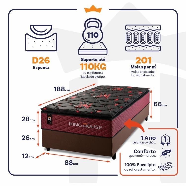 Dica Importante Gostou do produto, mas o tamanho não se encaixa à sua necessidade? Não tem problema, o Conjunto Cama Box Toronto está disponível em 5 medidas para que se adapte a qualquer ambiente. Nada melhor do que dormir confortavelmente, seja sozinho ou com seu parceiro, com um amplo espaço e conforto, não é mesmo?! Medidas do Colchão: 88x188x28 cm, 96X203x28 cm, 128x188x28 cm,138x188x28 cm, 158x198x28 cm, 193x203x28 cm. Medidas Colchão + Box: 88x188x66 cm, 96X203x66 cm, 138x188x66 cm, 158x198x66 cm, 193x203x66 cm. Cores do Colchão: Vermelho; Cores do Box: Branco PU, Cinza, Marrom e Preto. Caso você tenha interesse em visualizar os anúncios de alguma das opções acima, basta efetuar uma busca de acordo com as opções descritas. Introdução ao Produto: Sabe aquela sensação de felicidade e satisfação que você sente quando faz uma boa escolha?! Pois bem, essa é a sensação de comprar um Conjunto Cama Toronto. Um produto moderno com design elegante, que irá transformar para sempre suas noites de sono :) Feito com os mais nobres materiais em sua composição, ele conta com espuma D26 e molas ensacadas. Por ser mais macio, o colchão de molas ensacadas individualmente traz benefícios e ajuda no alinhamento da coluna. O colchão King House acomoda melhor o contorno do corpo, dispondo de forma correta quadris e ombros, expulsando as dores e problemas de coluna. Não perca mais tempo e garanta já o seu colchão Toronto! Características: - Espuma D26; - 201 molas por m2 ensacadas individualmente; - Suporta até 120 kg por pessoa. Características do Box: - 100% eucalipto; - Pés com 12 cm de altura; Dimensões: - Altura: 28 cm (colchão) + 26 cm (box) + 12 cm (pés) = 66 cm de altura; - Largura : 88 cm; - Comprimento: 188 cm. Conteúdo da embalagem: - 01 Colchão Solteiro Toronto Vermelho; - 01 Box - 04 Pés de PVC - 01 Certificado de garantia. - 01 Manual de montagem. Garantia: 1 ano de garantia nas molas, 1 ano de garantia nas espumas e 3 meses no revestimento. Informações Relevantes: - É imprescindível ter ciência de que é possível que haja divergência de tonalidade nos tecidos devido às variações de configurações de monitores/telas e lotes do fornecedor; - Não nos responsabilizamos pelo transporte por escadas, elevadores, guincho ou içamento deste produto, qualquer despesa é de responsabilidade do cliente; - Verifique as dimensões do produto, certificando-se de que o mesmo possa ser transportado por portas, corredores e elevadores; - Os objetos que decoram a imagem, não acompanham o produto; - Não nos responsabilizamos pela instalação e montagem; - Prestamos assistência somente por defeitos de fabricação. Nosso produto é certificado pelo INMETRO! CERTIFICADO DE CONFORMIDADE NÚMERO: 07424-001-02/2019 OCP: 003