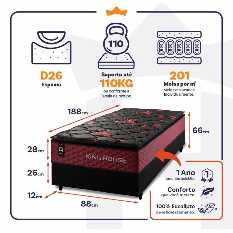 Dica Importante Gostou do produto, mas o tamanho não se encaixa à sua necessidade? Não tem problema, o Conjunto Cama Box Toronto está disponível em 5 medidas para que se adapte a qualquer ambiente. Nada melhor do que dormir confortavelmente, seja sozinho ou com seu parceiro, com um amplo espaço e conforto, não é mesmo?! Medidas do Colchão: 88x188x28 cm, 96X203x28 cm, 128x188x28 cm,138x188x28 cm, 158x198x28 cm, 193x203x28 cm. Medidas Colchão + Box: 88x188x66 cm, 96X203x66 cm, 138x188x66 cm, 158x198x66 cm, 193x203x66 cm. Cores do Colchão: Vermelho; Cores do Box: Branco PU, Cinza, Marrom e Preto. Caso você tenha interesse em visualizar os anúncios de alguma das opções acima, basta efetuar uma busca de acordo com as opções descritas. Introdução ao Produto: Sabe aquela sensação de felicidade e satisfação que você sente quando faz uma boa escolha?! Pois bem, essa é a sensação de comprar um Conjunto Cama Toronto. Um produto moderno com design elegante, que irá transformar para sempre suas noites de sono :) Feito com os mais nobres materiais em sua composição, ele conta com espuma D26 e molas ensacadas. Por ser mais macio, o colchão de molas ensacadas individualmente traz benefícios e ajuda no alinhamento da coluna. O colchão King House acomoda melhor o contorno do corpo, dispondo de forma correta quadris e ombros, expulsando as dores e problemas de coluna. Não perca mais tempo e garanta já o seu colchão Toronto! Características: - Espuma D26; - 201 molas por m2 ensacadas individualmente; - Suporta até 120 kg por pessoa. Características do Box: - 100% eucalipto; - Pés com 12 cm de altura; Dimensões: - Altura: 28 cm (colchão) + 26 cm (box) + 12 cm (pés) = 66 cm de altura; - Largura : 88 cm; - Comprimento: 188 cm. Conteúdo da embalagem: - 01 Colchão Solteiro Toronto Vermelho; - 01 Box - 04 Pés de PVC - 01 Certificado de garantia. - 01 Manual de montagem. Garantia: 1 ano de garantia nas molas, 1 ano de garantia nas espumas e 3 meses no revestimento. Informações Relevantes: - É imprescindível ter ciência de que é possível que haja divergência de tonalidade nos tecidos devido às variações de configurações de monitores/telas e lotes do fornecedor; - Não nos responsabilizamos pelo transporte por escadas, elevadores, guincho ou içamento deste produto, qualquer despesa é de responsabilidade do cliente; - Verifique as dimensões do produto, certificando-se de que o mesmo possa ser transportado por portas, corredores e elevadores; - Os objetos que decoram a imagem, não acompanham o produto; - Não nos responsabilizamos pela instalação e montagem; - Prestamos assistência somente por defeitos de fabricação. Nosso produto é certificado pelo INMETRO! CERTIFICADO DE CONFORMIDADE NÚMERO: 07424-001-02/2019 OCP: 003