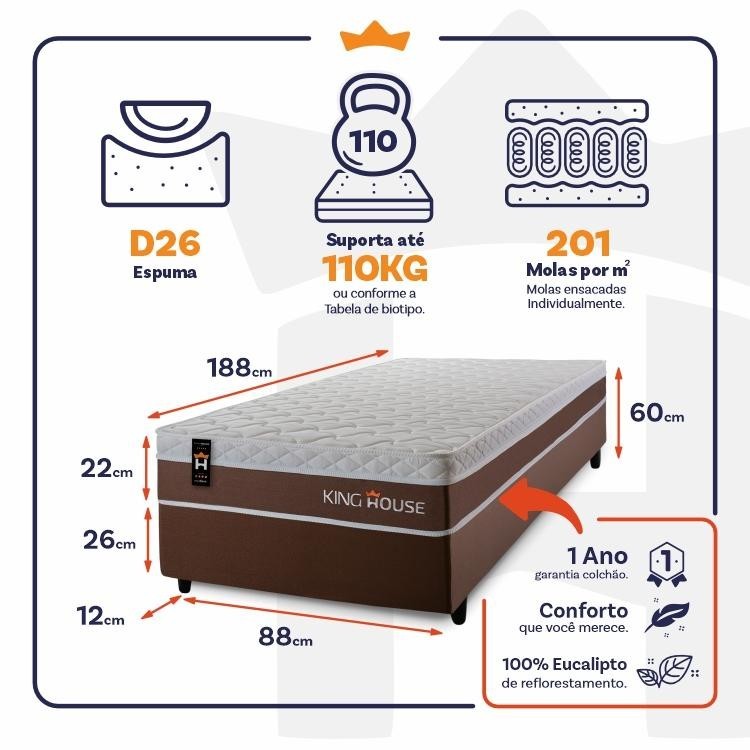 Dica Importante Gostou do produto, mas o tamanho não se encaixa à sua necessidade? Não tem problema, o Conjunto Cama Box Venice está disponível em 5 medidas com 4 variações de cores nos box para que se adapte a qualquer ambiente. Nada melhor do que dormir confortavelmente, seja sozinho ou com seu parceiro, com um amplo espaço e conforto, não é mesmo?! Medidas do Colchão: 88x188x22 cm, 96X203x22 cm, 138x188x22 cm, 158x198x22, 193x203x22 cm. Medidas Colchão + Box: 88x188x60 cm, 96X203x60 cm,138x188x60 cm, 158x198x60 cm, 193x203x60 cm. Cores do Colchão: Marrom; Cores do Box: Branco PU, Cinza, Marrom e Preto. Caso você tenha interesse em visualizar os anúncios de alguma das opções acima, basta efetuar uma busca de acordo com as opções descritas. Introdução ao Produto: Sabe aquela sensação de felicidade e satisfação que você sente quando faz uma boa escolha?! Pois bem, essa é a sensação de comprar um Conjunto Cama Venice. Um produto moderno com design elegante, que irá transformar para sempre suas noites de sono :) Feito com os mais nobres materiais em sua composição, ele conta com espuma D26 e molas ensacadas. Por ser mais macio, o colchão de molas ensacadas individualmente traz benefícios e ajuda no alinhamento da coluna. O colchão King House acomoda melhor o contorno do corpo, dispondo de forma correta quadris e ombros, expulsando as dores e problemas de coluna. Não perca mais tempo e garanta já o seu colchão Venice! Características: - Espuma D26; - 201 molas por m2 ensacadas individualmente; - Suporta até 120 kg por pessoa. Características do Box: - 100% eucalipto; - Pés com 12 cm de altura; Dimensões: - Altura: 22 cm (colchão) + 26 cm (box) + 12 cm (pés) = 60 cm de altura; - Largura : 88 cm; - Comprimento: 188 cm. Conteúdo da embalagem: - 01 Colchão Solteiro Venice Marrom; - 01 Box - 04 Pés de PVC - 01 Certificado de garantia. - 01 Manual de montagem. Garantia: 1 ano de garantia nas molas, 1 ano de garantia nas espumas e 3 meses no revestimento. Informações Relevantes: - É imprescindível ter ciência de que é possível que haja divergência de tonalidade nos tecidos devido às variações de configurações de monitores/telas e lotes do fornecedor; - Não nos responsabilizamos pelo transporte por escadas, elevadores, guincho ou içamento deste produto, qualquer despesa é de responsabilidade do cliente; - Verifique as dimensões do produto, certificando-se de que o mesmo possa ser transportado por portas, corredores e elevadores; - Os objetos que decoram a imagem, não acompanham o produto; - Não nos responsabilizamos pela instalação e montagem; - Prestamos assistência somente por defeitos de fabricação. Nosso produto é certificado pelo INMETRO! CERTIFICADO DE CONFORMIDADE NÚMERO: 07424-001-02/2019 OCP: 003